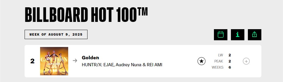 HUNTR/X, Golden. คงที่อยู่ในอันดับที่ #2 บนชาร์ต Billboard Hot100 ประจำสัปดาห์นี้! [weeks 6]
