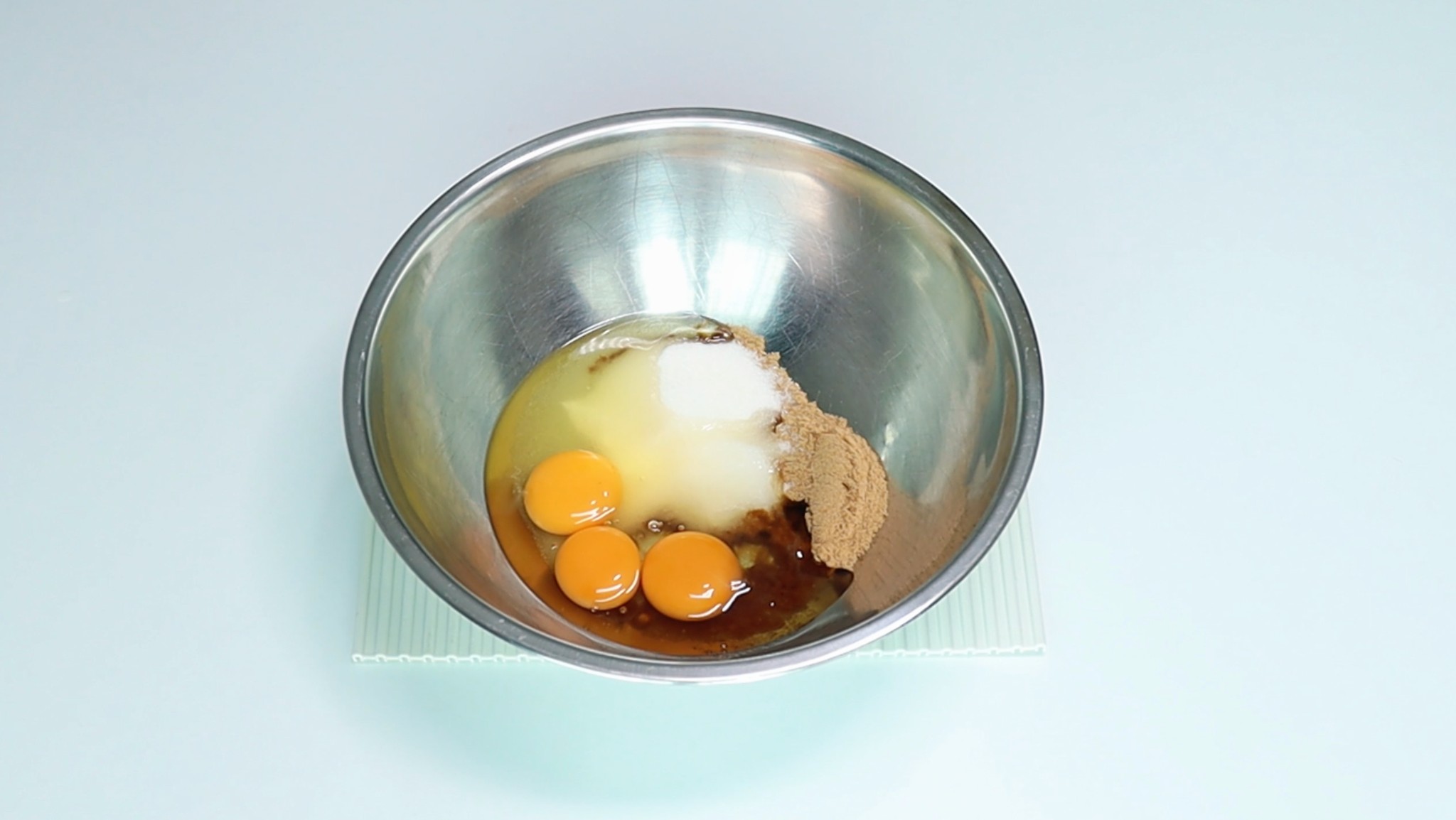 - ผสมไข่ไก่ น้ำตาลทรายแดง และน้ำตาลทรายขาวเข้าด้วยกันในชามผสม