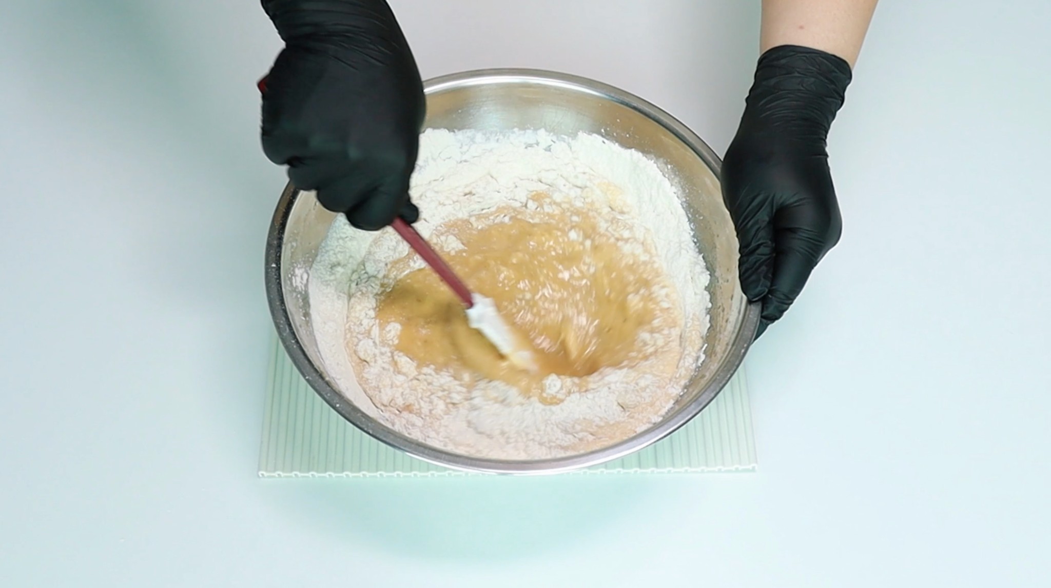 - ใช้พายยางตะล่อมเบา ๆ จนไม่มีแป้งแห้งตกค้าง