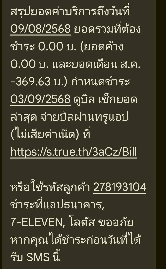 ผมได้ไปที่โรบินสันลพบุรี จุด ทรูช็อปเพื่อยกเลิกอินเตอร์เน็ตบ้าน ได้จ่ายเงิน ปิด หมายเลขเรียบร้อย คืนเราเตอร์ คืนกล่องทรูออนไลน์ ต่อมาสังเกตที่แอพฯทรู ยังมี การเรียกเก็บเงินมาอีก แต่ผมก็เข้าใจแหละ ว่าทรู เป็นแบบนี้ ผมก็จ่ายนะ จ่ายไปแล้วที่เรียกเก็บในแอพพลิเคชั่น คิดว่าจะจบ แต่ไม่เลย ไม่จบ ตอนนี้ยังมีข้อความเข้ามา เรียกเก็บเงินอีก ครั้งแรก จ่ายตอนไปยกเลิกที่ทรูช้อป ครั้งที่สอง จ่ายให้ไป ในแอพพลิเคชั่น ครั้งนี้เรียกเก็บเงินอีก จากข้อความที่เข้ามา วันนี้ เมื่อไหร่จะจบ สักที