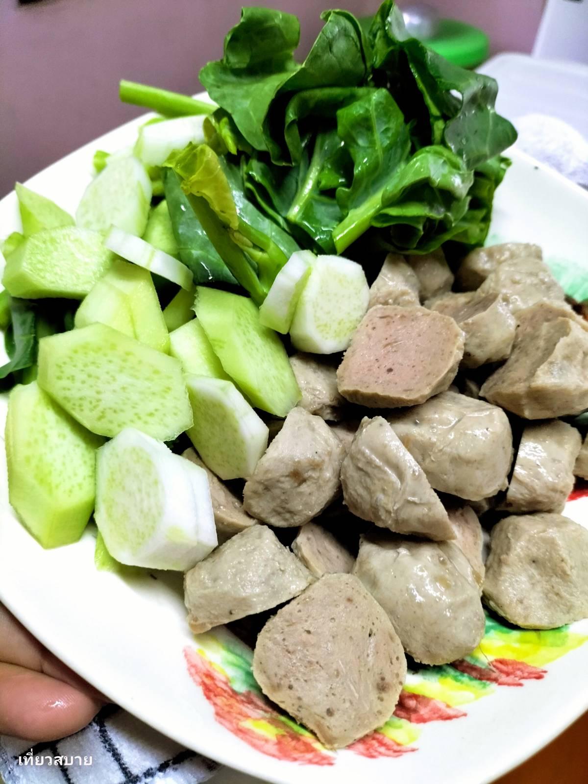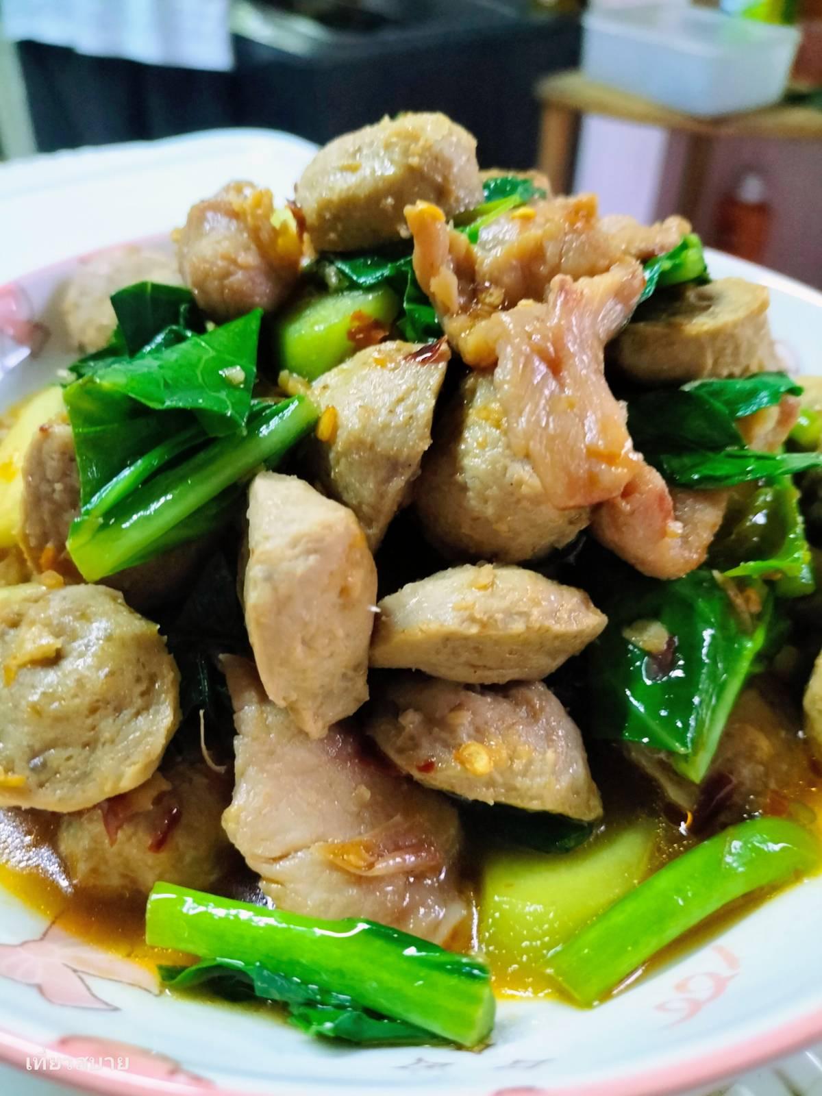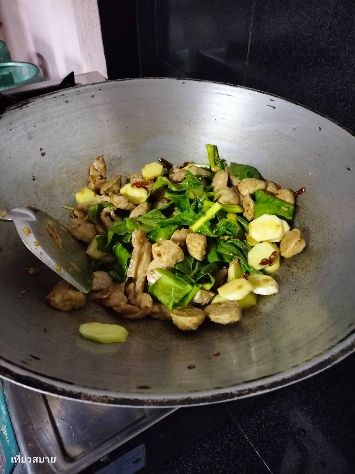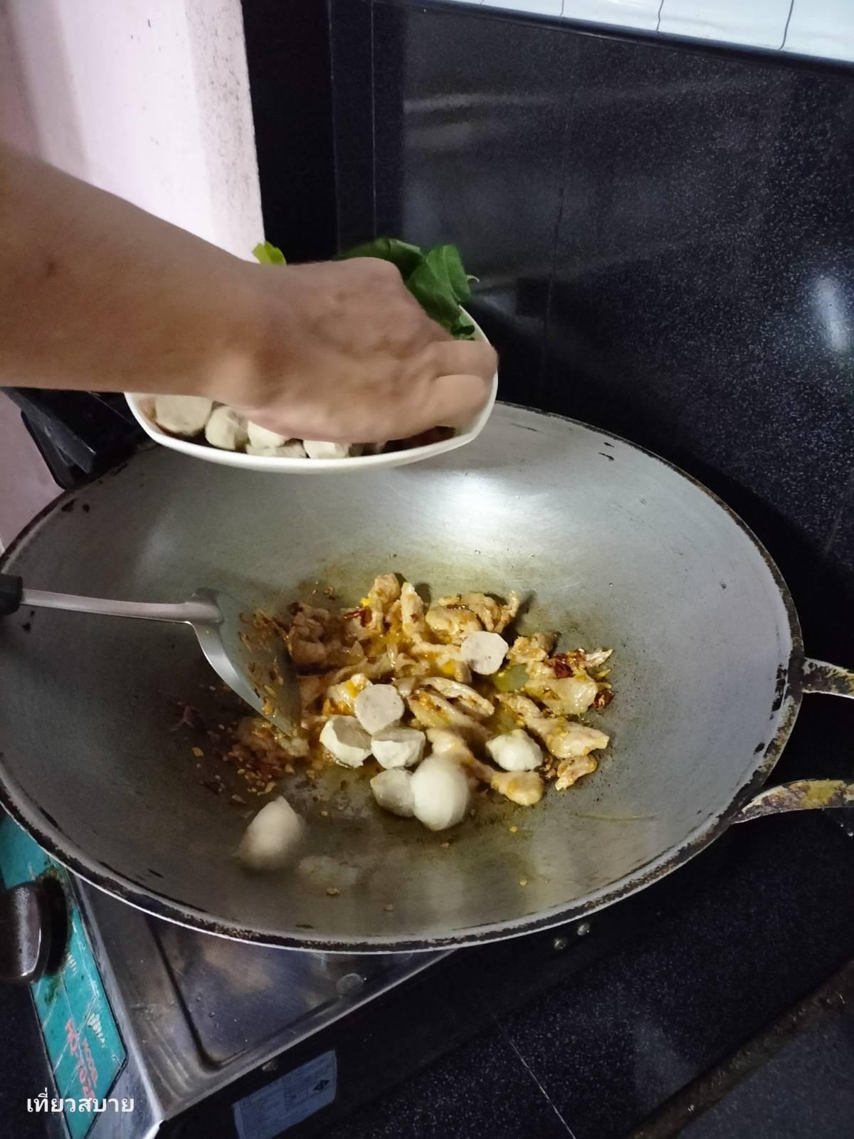 2.ใส่ลูกชิ้น ใส่ผักคะน้า ปรุงรสด้วยน้ำปลา น้ำตาลเล็กน้อย