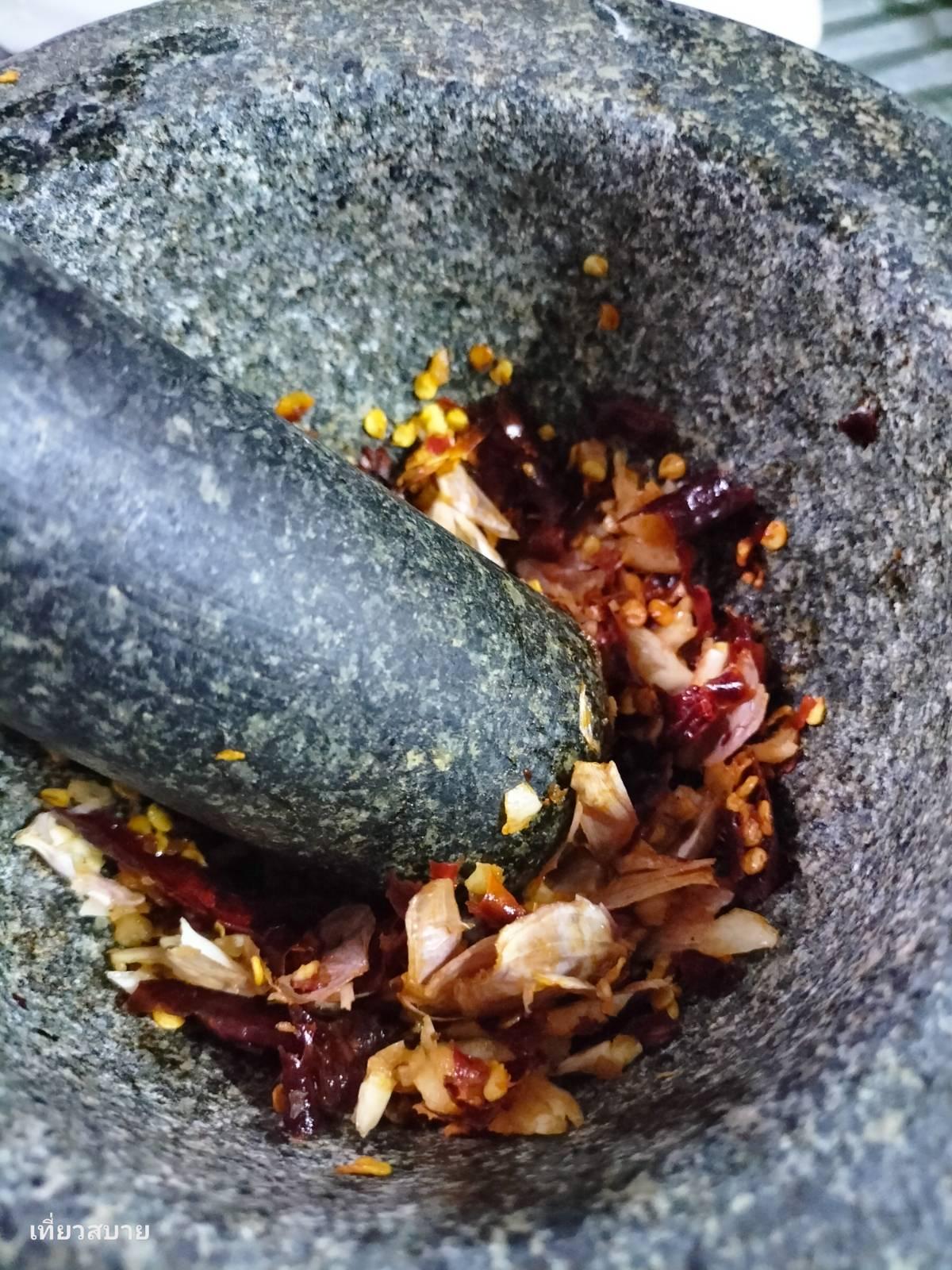 1.ตำพริกแห้งกับกระเทียมพอหยาบๆ นำลงไปผัดให้หอม