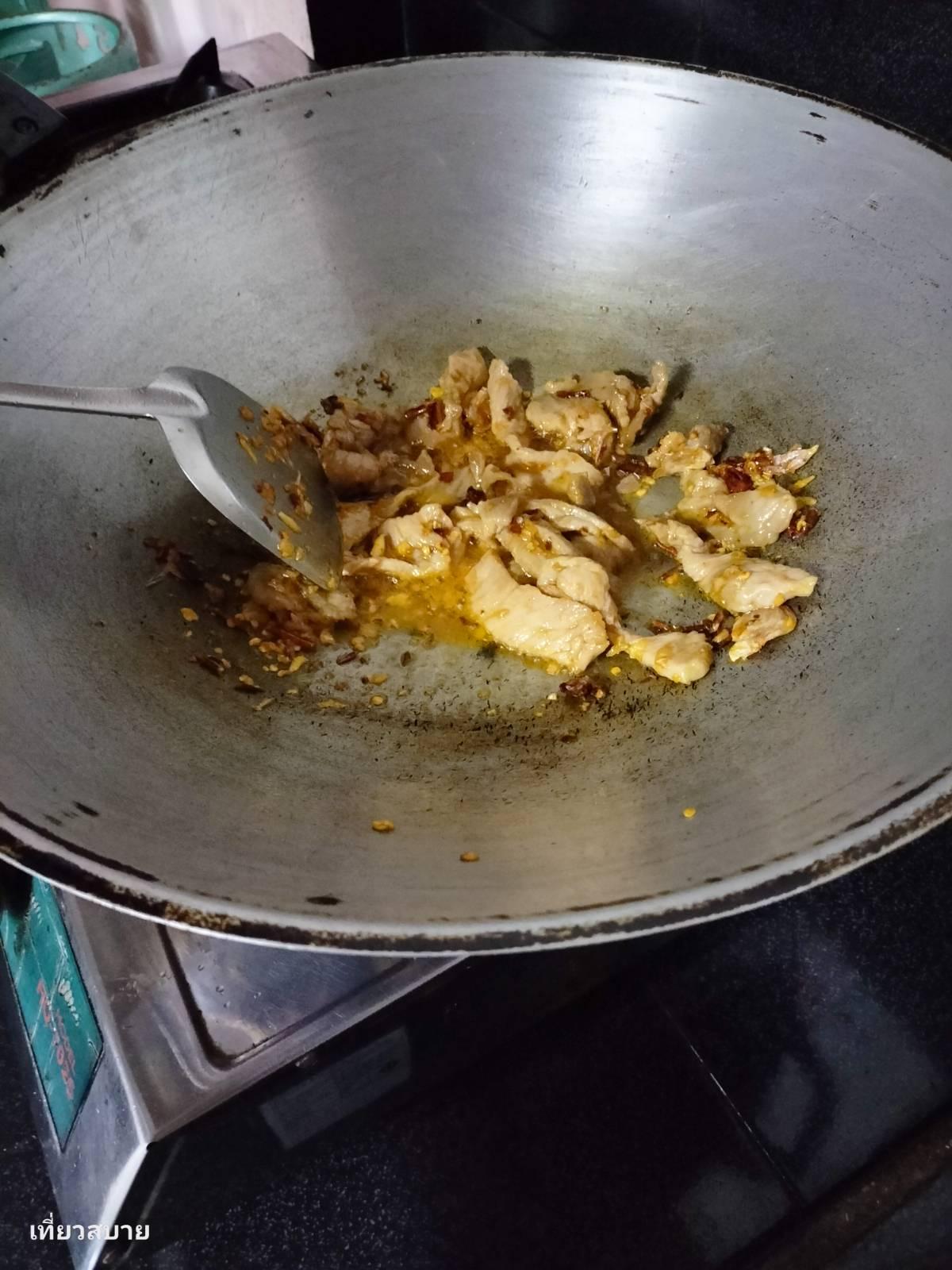 (มีหมูหมักเหลืออยู่นิดหน่อย ก็เลยเอามาผัดรวมกัน)