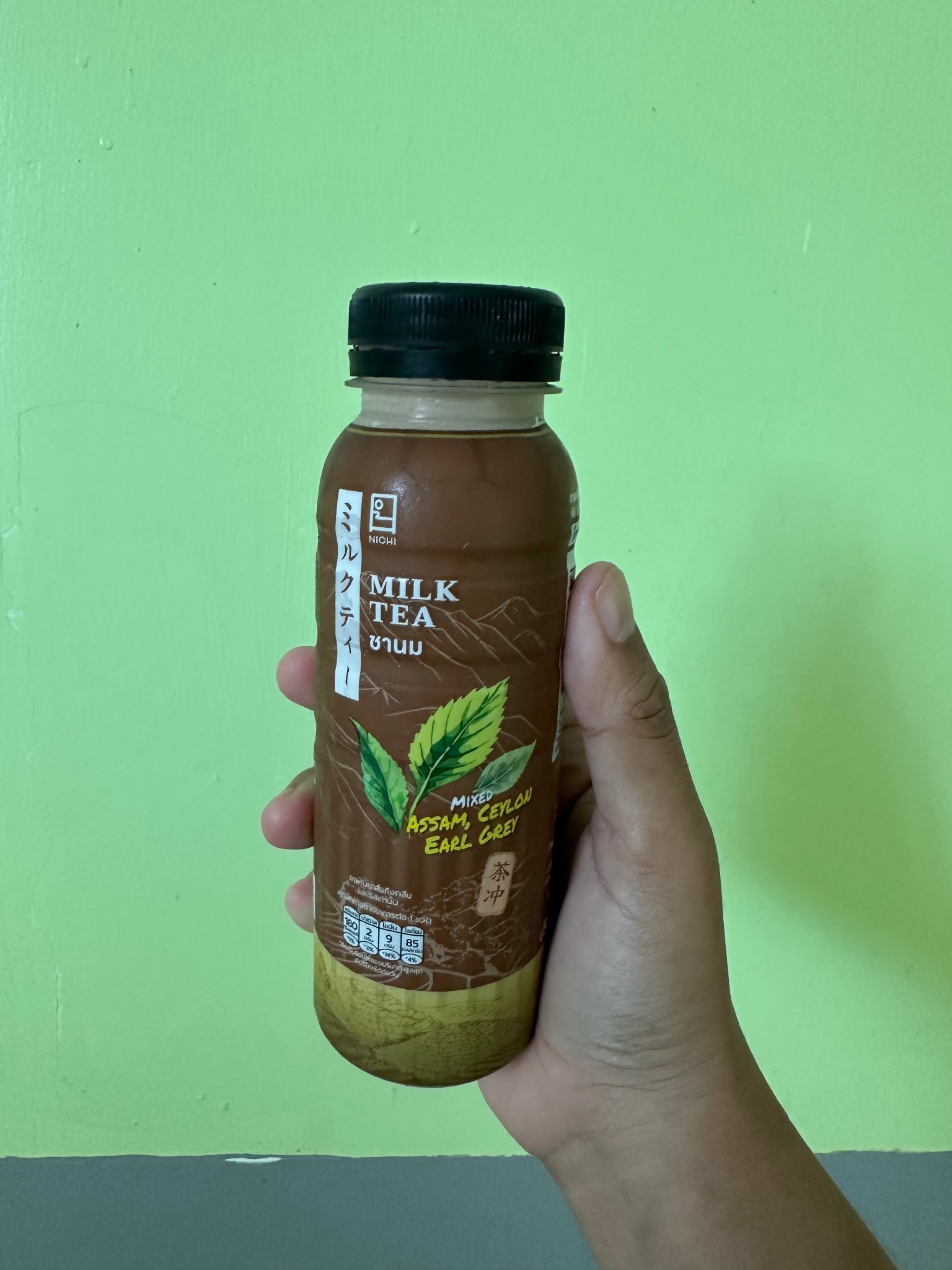 ขวดสีน้ำตาลเข้ม ดูเรียบหรู มีลายใบชาชัดเจน ขนาดพอดีมือ เปิดฝาแล้วกลิ่นหอมชาลอยมาเลย หอมแบบกลมๆ ไม่ฉุนเกินไป