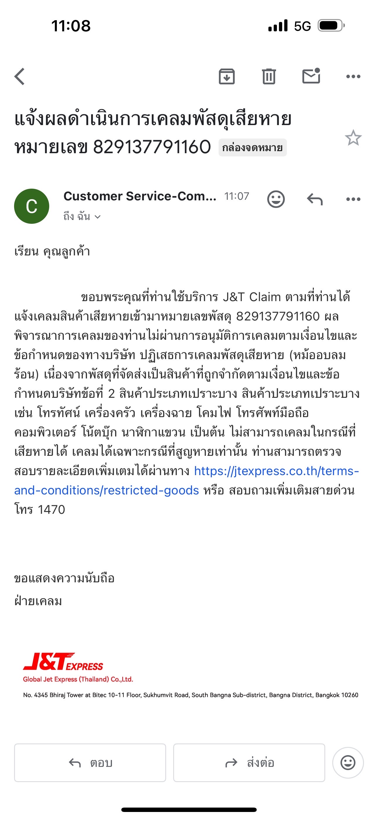 ขนส่ง J&T ทำพัสดุเสียหายแล้วไม่รับผิดชอบ