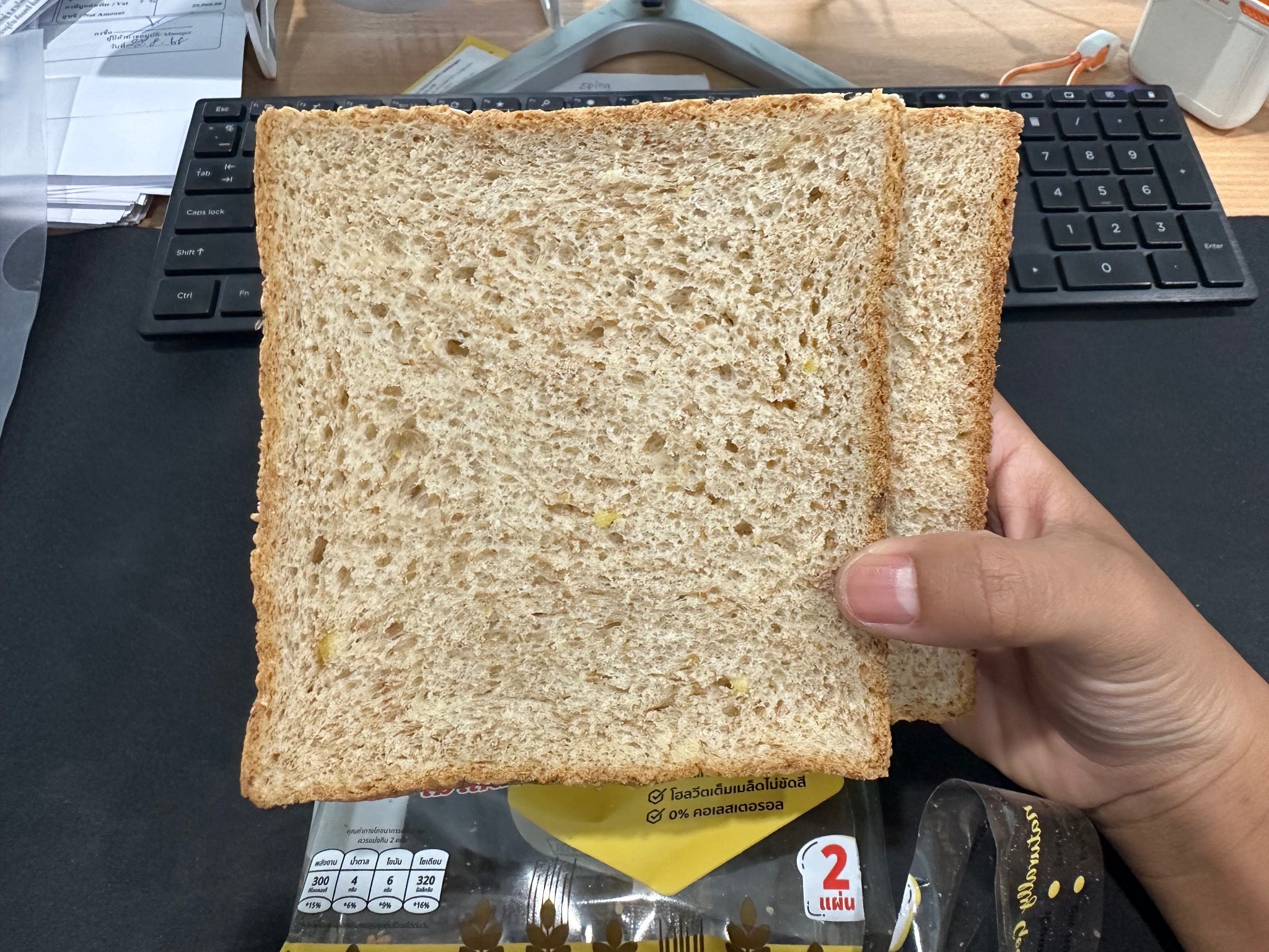 ตรงขอบโรยงาแน่นๆ แทบจะล้นซอง หล่นเยอะเลย เนื้อขนมปังเป็นโฮลวีตแท้ๆ สีน้ำตาลเข้ม หอมแบบข้าวอบใหม่ๆ แล้วก็มีน้องถั่วลูกไก่ด้วยจ้า หยิบขึ้นมาคือฟีลลิ่งแบบ ขนมปังสายสุขภาพ แต่หล่อมากกก คำแรกคือเม็ดงาเต็มซอกฟันจ้า 555+ เนื้อขนมปังไม่แข็ง ไม่เหนียว แต่หนึบกำลังดี เคี้ยวเพลินจนลืมไปเลยว่านี่คือเมนูสายเฮลตี้คือจะกินเปล่าๆ ก็ได้ กินกับสลัดก็เข้ากัน กินกับชานมไข่มุกยังได้ แถมความมันของธัญพืชคือ แซ่บเสย