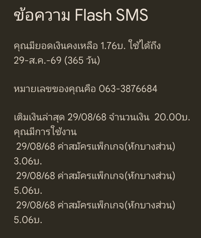 พอเติมไปรอบที่2 20บาท ไปเช็คในแชทก็บอกยอกคงเหลือ20บาท เเต่ก็รู้สึกว่ามันเเปลกๆเลยไปเช็คเเบบพิมเบอร์ *121# ก็เจอว่ายอดเหลือเเค่1.76บาท ตอนนั้นตกใจมาก พอรอไปสักพักข้อความจากรูปก็โผล่ขึ้นมาว่าเพราะอะไรเงินถึงหายไปเยอะ ก็อ่านไปพอเข้าใจได้ทำไมเงินถึงหายไปรวมเเล้ว13.18บาท เเต่เงิน 6.82 ที่เหลือหายไปไหนอันนี้ไม่รู้ เลยอยากจะสอบถามผู้รู้ว่าเกิดอะไรขึ้น เพราะมันเป็นมาสักพักเเล้ว ถ้ามันเป็นเเบบนี้ต่อไปเรื่อยๆก็ไม่รู้ว่าจะไปใช้ค่ายไหนต่อดี เน็ตก็ไม่เเรงเสียตังฟรีเปล่าๆเลย