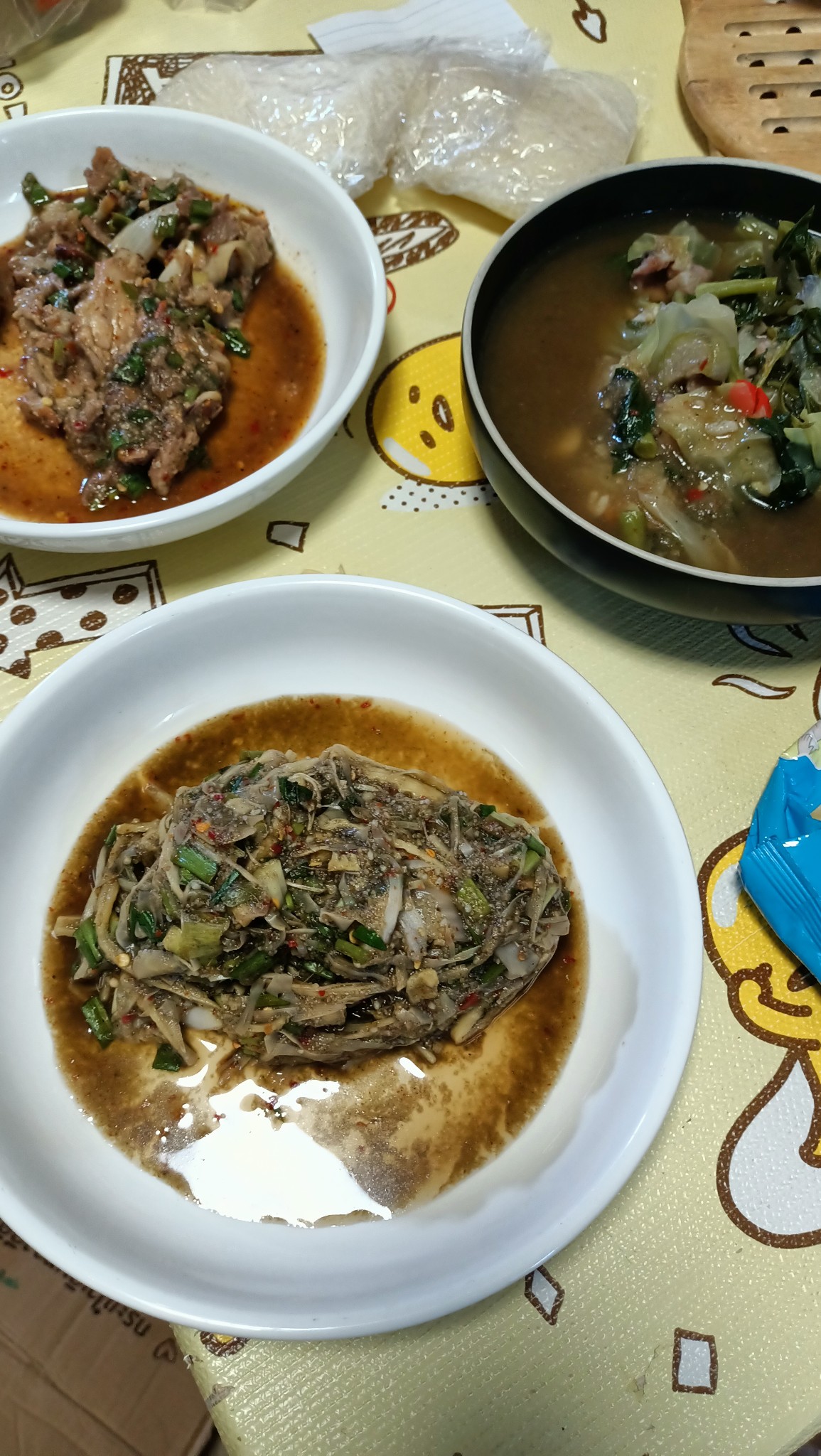 กับข้าว วันพระ ผัดบุ้งผัดหมูสามชั้นเจ แกงอ่อมเจ หมึกจำแลง ข้าวเหนียวกลอย+ข้าวเม่าคลุก