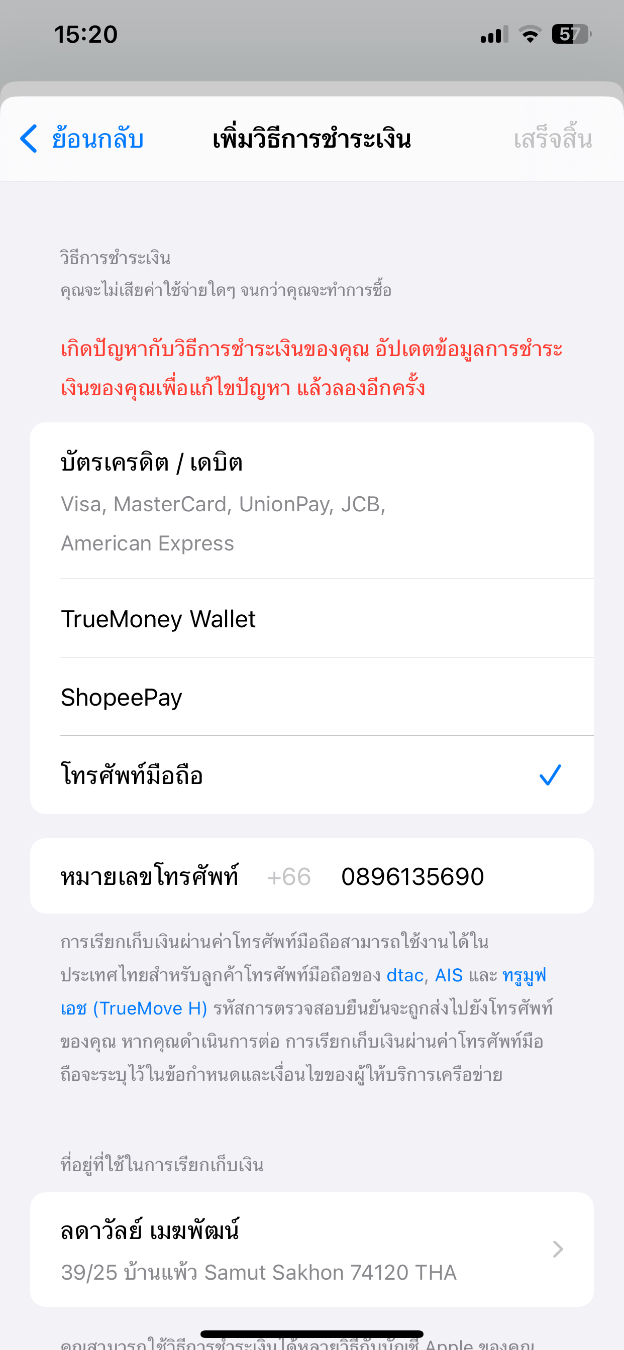 ชำระเงินผ่านเครือข่ายมือถือไม่ได้
