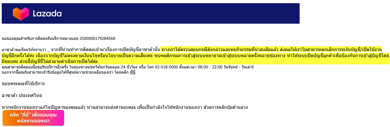 ผมได้ทำการเปลี่ยนโทรศัพท์เครื่องใหม่ และได้เข้าสู่ระบบ Lazada ประมาณ 2-3 ครั้ง จากนั้น ระบบก็ขึ้นให้ติดต่อเจ้าหน้าที่ เนื่องจากบัญชีถูกล็อค ผมเลยโทรไปที่เบอร์ที่ให้ไว้ และต่อมาก็ได้รับ email ข้อความระบุว่า "ไม่สามารถยกเลิกการระงับบัญชีได้" ผมสงสัยว่า Lazada ไม่มีวิธีกู้คืนบัญชีอย่างอื่นแล้วเหรอครับ ผมได้เพิ่มสินค้าไว้ในตะกร้าเพื่อจะทำการสั่งซื้อสินค้าไว้พอสมควร ยอมรับว่าผิดหวังที่เคยเป็นลูกค้ามายาวนาน และคงไม่กลับไปสมัครใหม่อีก
