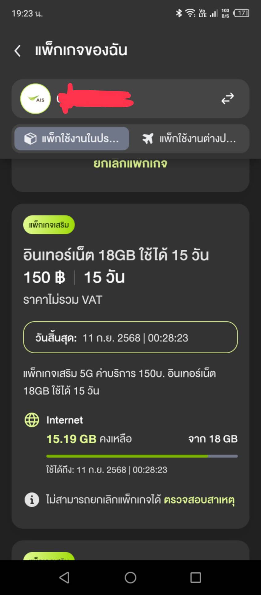 ผมได้ซื้อแพ็คเกจเสริม ais เน็ต18gb อายุ15วัน 150บาท ซื้อวันที่27/8/2568 เนื่องจากเน็ตแพ็คเกจหลักผมหมด