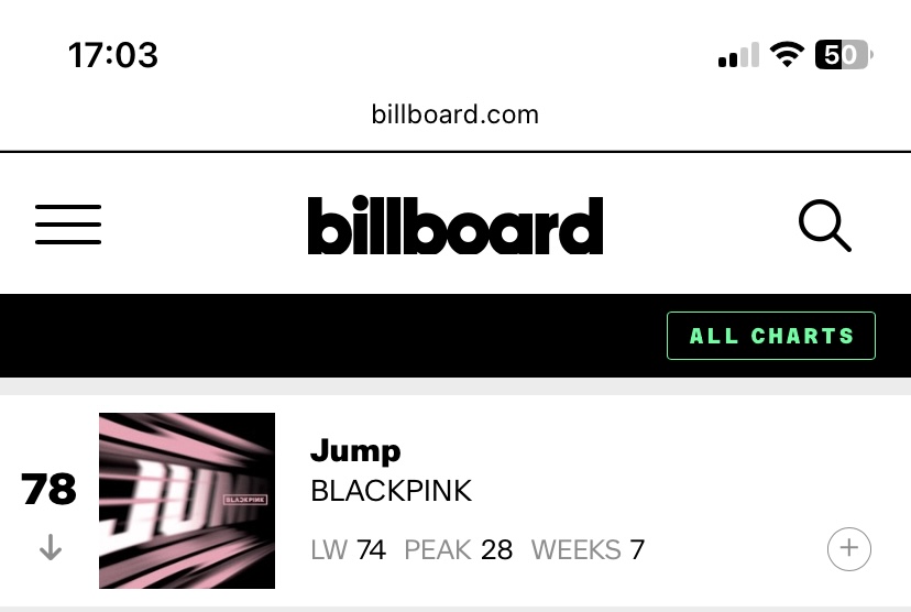 BLACKPINK JUMP อยู่อันดับที่ 78 บนชาร์ต Billboard Hot 100 ในสัปดาห์นี้ (สัปดาห์ที่ 7)