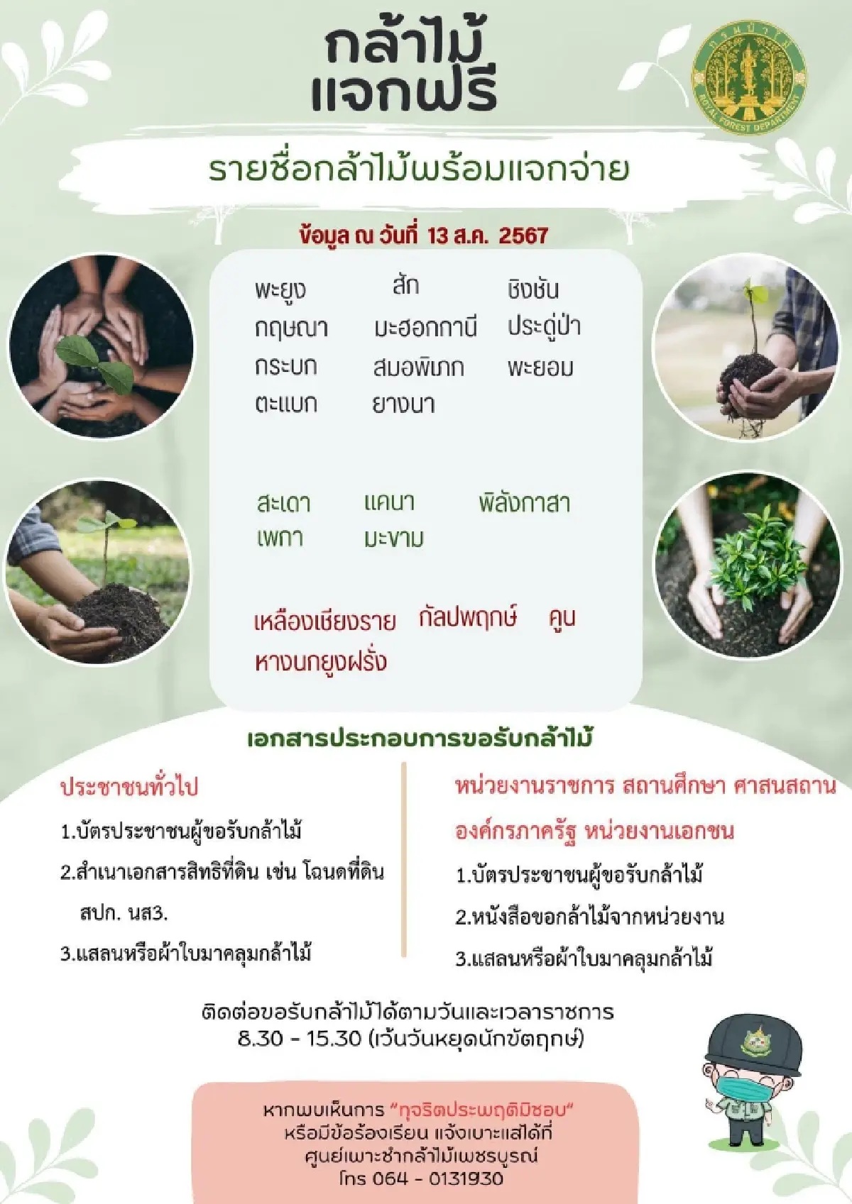 ผู้สนใจขอรับกล้าไม้ตรวจสอบรายชื่อกล้าไม้ พร้อมเตรียมเอกสารประในการขอรับกล้าไม้ มาขอรับได้ตามวันและเวลาราชการ