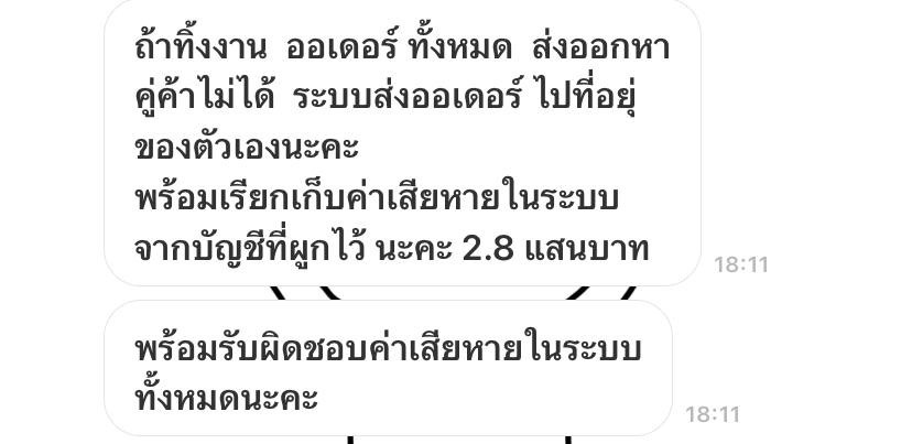 “ขอเรียนแจ้งให้ทราบครั้งสุดท้ายนะคะ ตอนนี้ทางบริษัทนำส่งสินค้าไม่ได้เนื่องจากสมาชิกยังทำงานไม่เสร็จ ปล่อยสินค้าค้างไว้ในระบบทำงาน หากภายในวันนี้ไม่มีการติดต่อทำรายการให้เสร็จ หรือยกเลิกบัญชีการทำงานออกจากระบบให้เรียบร้อย ทางเราขอส่งรายชื่อให้ฝ่ายกฎหมายดำเนินการต่อในส่วนของค่าเสียหายที่สมาชิกต้องรับผิดชอบต่อไป