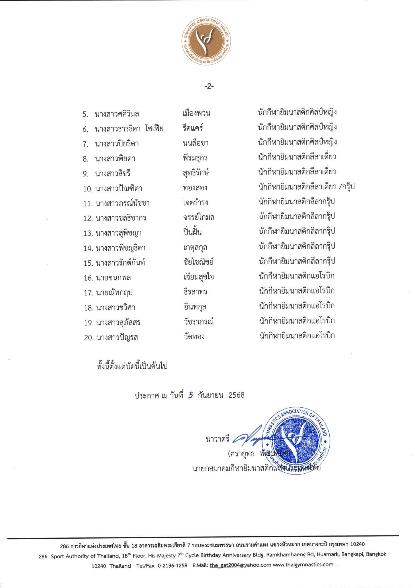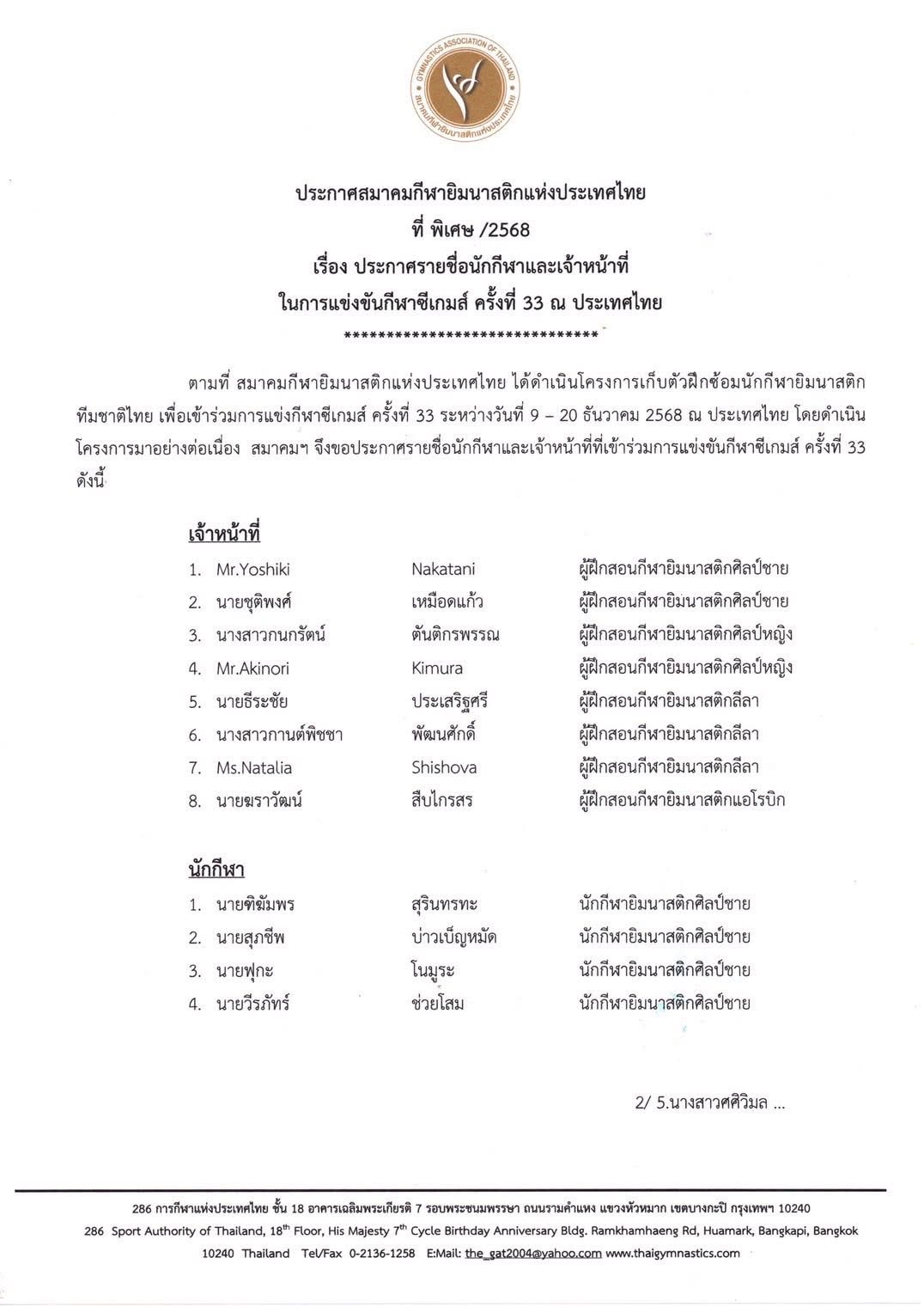 เมื่อวันศุกร์ที่ 5 กันยายน 2568 ที่ผ่านมา ทางสมาคมยิมนาสติกแห่งประเทศไทยได้ประกาศรายชื่อนักกีฬาและโค้ชผู้ฝึกสอนที่จะเข้าร่วมการแข่งขันกีฬาซีเกมส์ครั้งที่ 33 ซึ่งประเทศไทยจะรับหน้าที่เป็นเจ้าภาพในระหว่างวันที่ 9 - 20 ธันวาคม 2568 โดยจะจัดในกรุงเทพ ชลบุรี และสงขลา ปรากฏว่า มีรายชื่อโค้ชชาวญี่ปุ่น 2 คน และโค้ชชาวรัสเซียอีก 1 คน ที่จะทำหน้าที่เป็นผู้ฝึกสอนนักกีฬายิมนาสติกของไทย ทั้งยิมนาสติกศิลป์ชาย, ยิมนาสติกศิลป์หญิง และยิมนาสติกลีลา โดยโค้ชชาวญี่ปุ่นทั้ง 2 คน คือ Yoshiki Nakatani และ Akinori Kimura ซึ่งเป็นโค้ชผู้ฝึกสอนให้กับทีมยิมนาสติกศิลป์ชายและหญิงของไทย ส่วนโค้ชชาวรัสเซีย คือ Natalia Shishova ซึ่งเป็นโค้ชผู้ฝึกสอนให้กับทีมยิมนาสติกลีลาของไทย