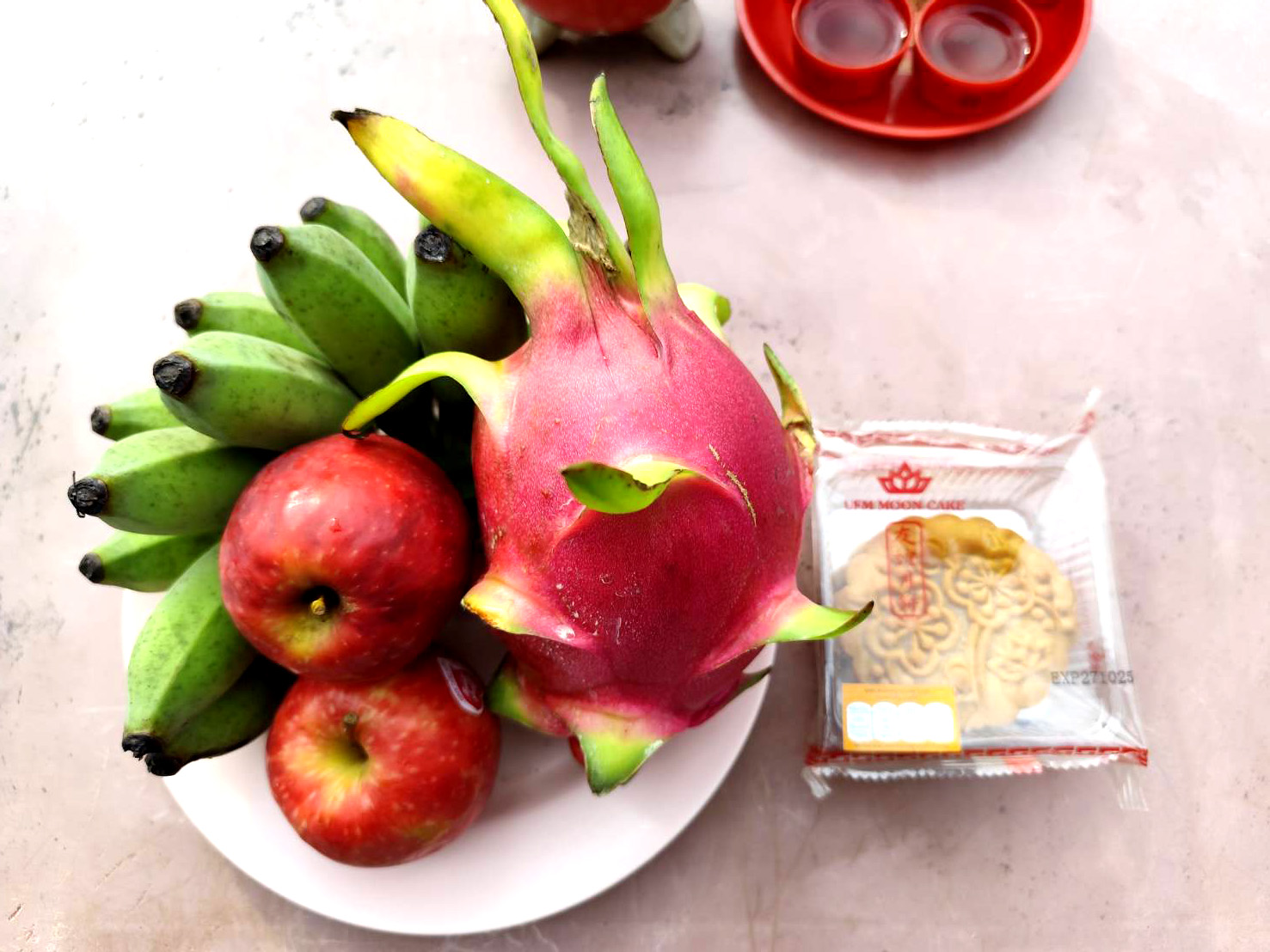 ก็จะมีผลไม้ 3 อย่าง, น้ำชา และขนมไหว้พระจันทร์