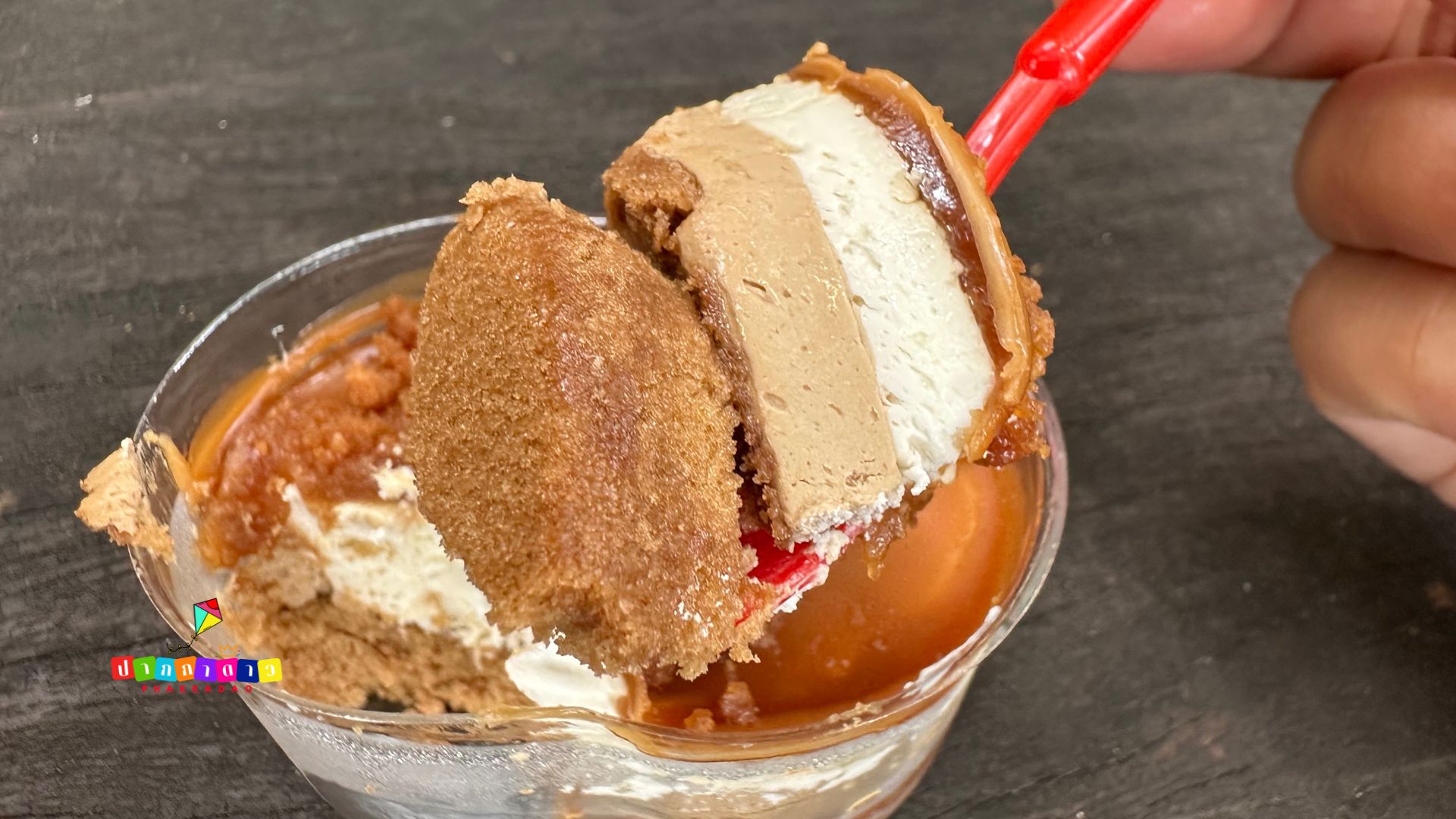 กินรวมกันแล้ว แซ่บนะ ขออีกคำ ทั้งความหวานของคาราเมล ความกรุบกรอบของบิสกิต และความนุ่มของมูสเค้ก