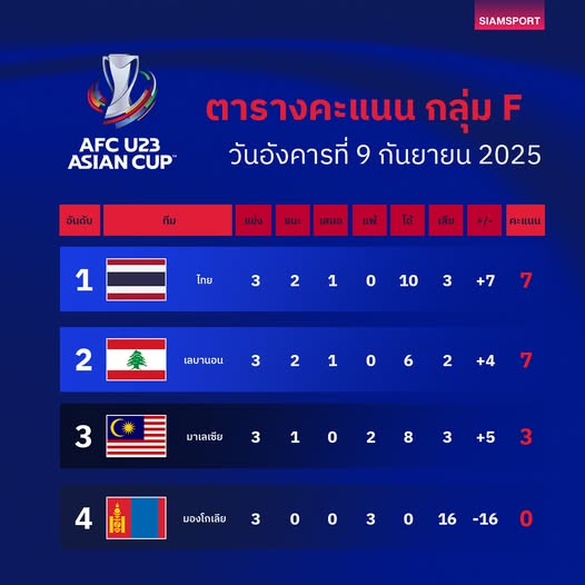ทีมชาติไทย U23 สร้างผลงานสุดยอด คว้าแชมป์ กลุ่ม F ฟุตบอลชิงแชมป์เอเชีย U23 รอบคัดเลือก หลังเก็บได้ 7 แต้มเท่ากับ เลบานอน แต่มีประตูได้-เสียดีกว่า