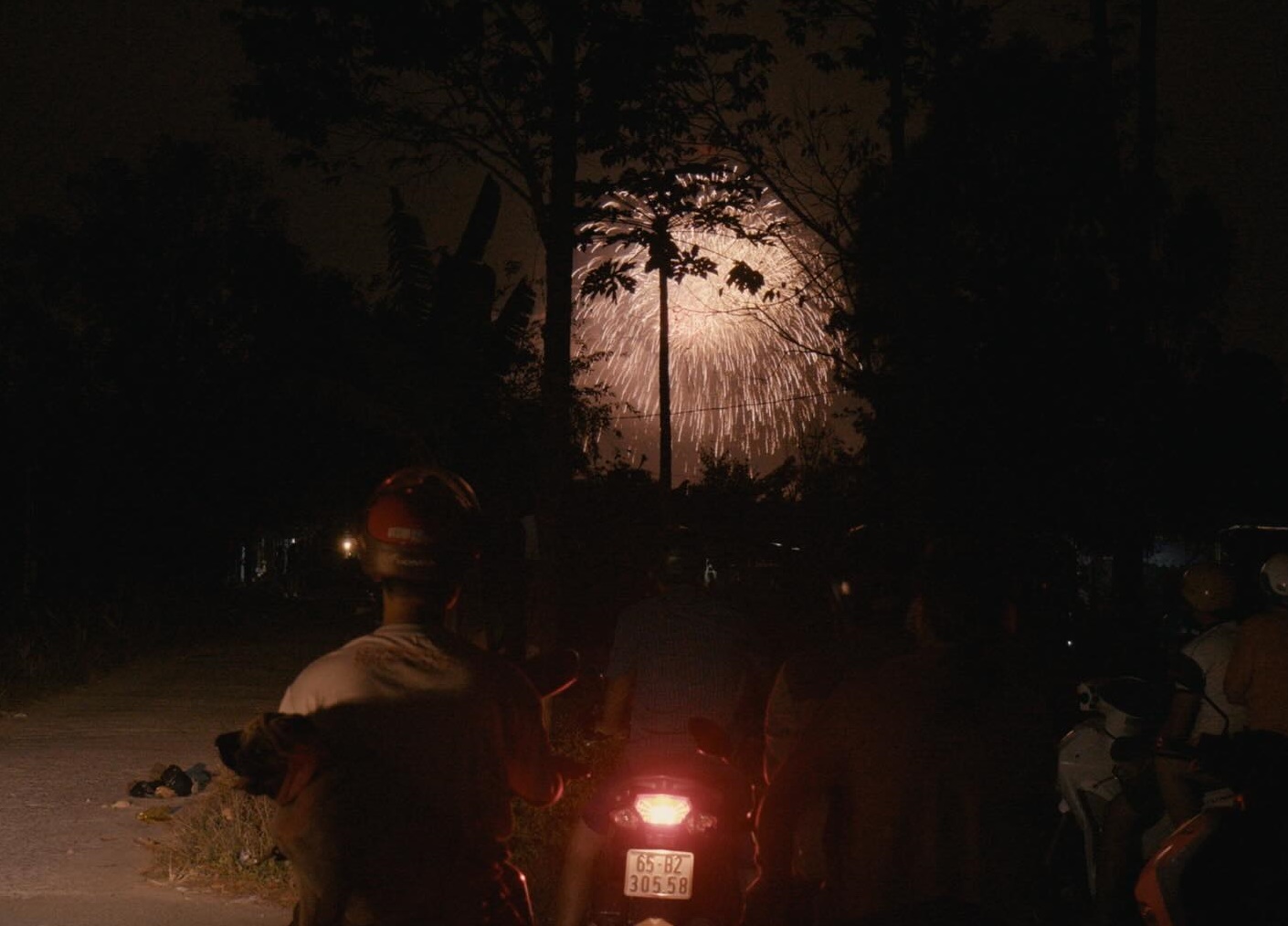 - ความธรรมดาที่เข้าถึงได้จากการมุงดูแสงสีจากตัวพลุที่จุดกันสนั่นฟ้าอย่างต่อเนื่องในคืนเทศกาลเต็ดของเวียดนาม มักจะมีความพิเศษใส่ไข่ภายใต้บรรยากาศอภิรมย์ชมชื่นนั่นคือการที่คนดูอย่างเราได้มีส่วนร่วมเข้าไปอยู่ในเหตุการณ์เสมือนเป็นเวียดนามมุงดูอย่างพร้อมใจกันโดยมิได้นัดหมายเลยสักคำ ระหว่างจ้องมองดูพลุที่จุดต่อไปไม่มีท่าทีว่าจะเลิกรา สายตาก็ได้ไปเห็นสิ่งมีชีวิตนึงที่ดูแปลกกว่าชาวบ้านที่กำลังโดนสะกดจิตหมู่นั่นคือน้อนหมาที่นั่งซ้อนท้ายอยู่บนเบาะนายทาสที่ยังคงจ้องมองพลุต่อไปด้วยความแน่วแน่จนกระทั่งค่อย ๆ ได้ยินเสียงดังขึ้นผ่านสีหน้าของน้อนทีกำลังส่ง Sign อะไรบางอย่างให้ผมรับรู้และเพิ่งมาเห็นเอาช่วงใกล้จะจากและคาดการณ์ได้ว่าคงนั่งแช่อยู่แบบนี้ตั้งแต่แรกเลยว่า นุด ๆ พวกนุดจะกลับกี่โมง ? กู หิว !!