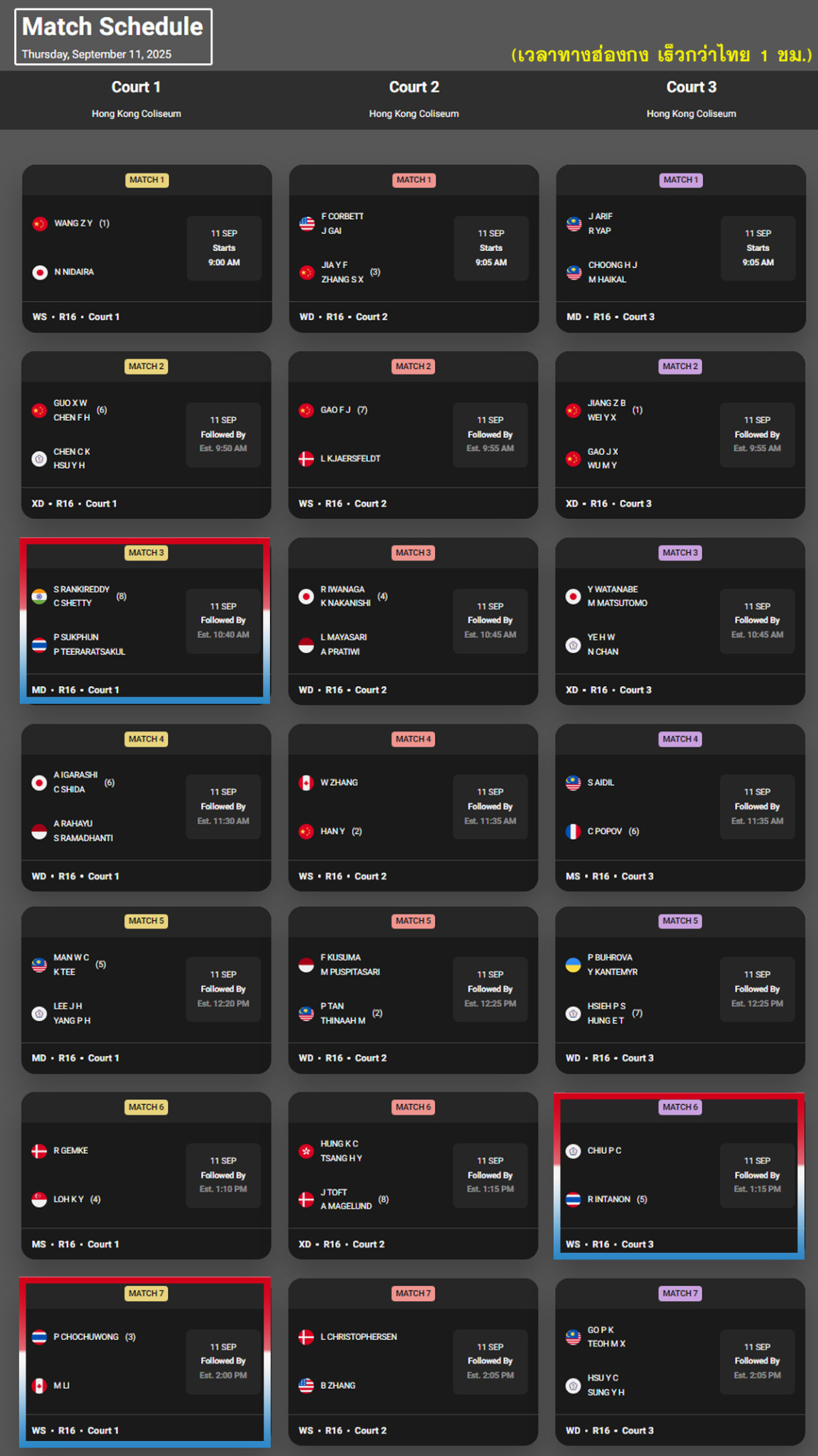 • Match Schedule [เวลาทาง Hong Kong เร็วกว่าไทย 1 ชม.]