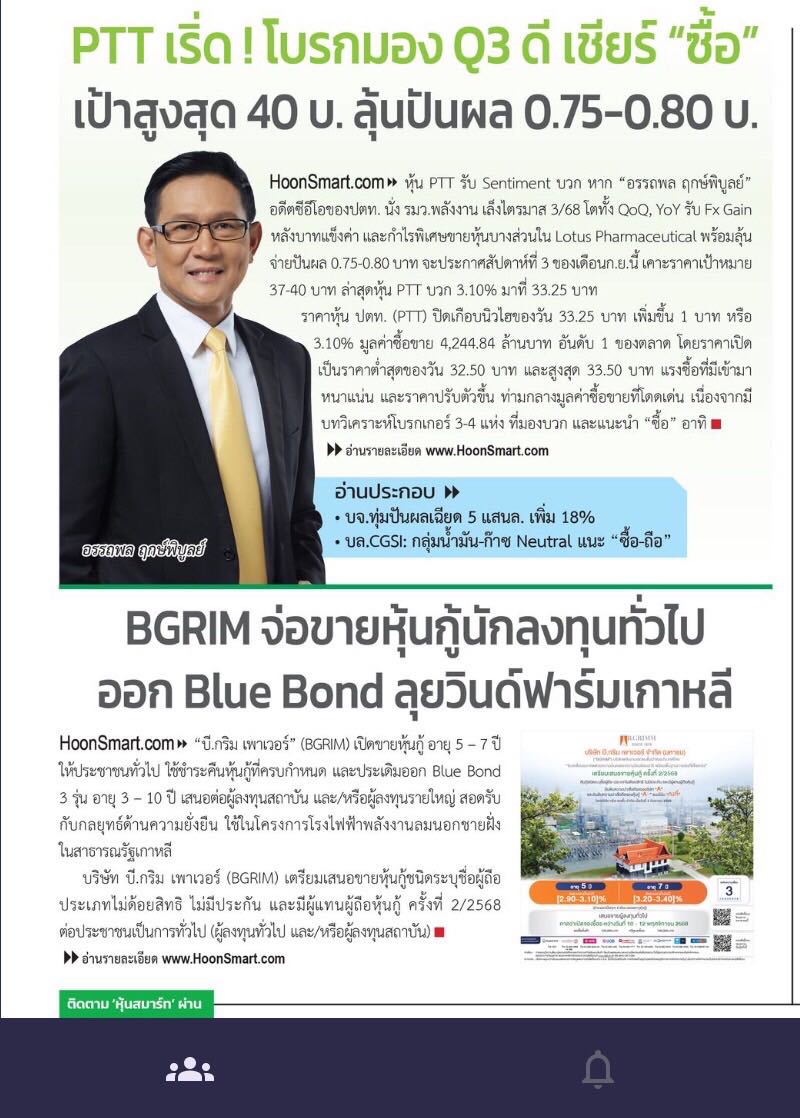รออยู่นะทั้งงพอร์ตปันผล และ พอร์ตเล่นรอบ วันนี้วันหยุดสัปดาห์ น่าจะมา หุ้น PTT บวก 3.10% โบรกคาด ครึ่งปีหลังสดใส ปัจจัยหนุนนโยบายรัฐ-บาทแข็ง-ปันผล ณัฐนนท์ มนต์ขลัง CISA นักวิเคราะห์ปัจจัยพื้นฐานด้