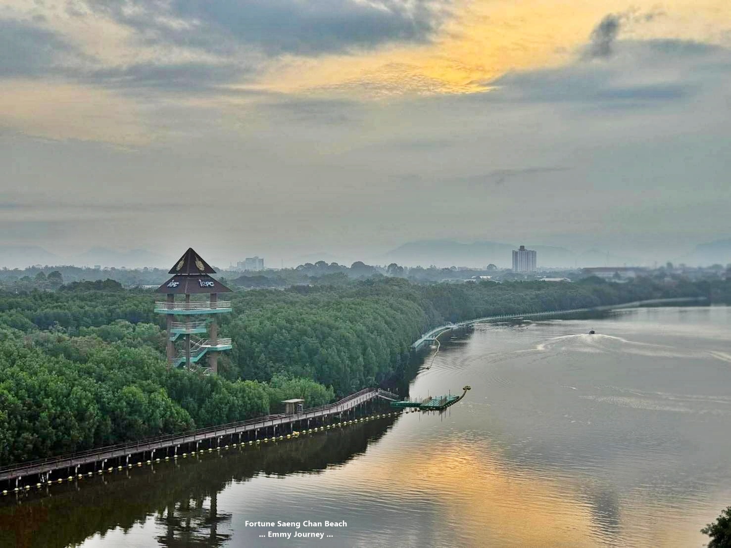 เราชอบมานั่งชมวิวที่มุมนี้ ช่วงเช้าน้ำขึ้นจะมีคนพายเรือมาหาปลา และบางคนก็เดินออกกำลังกายตอนเช้าและตอนเย็นที่ศูนย์การเรียนรู้ป่าชายเลน