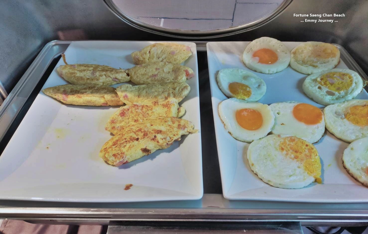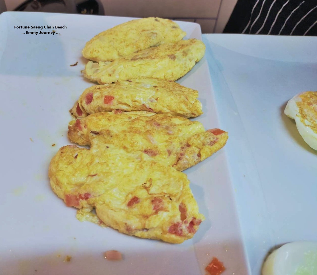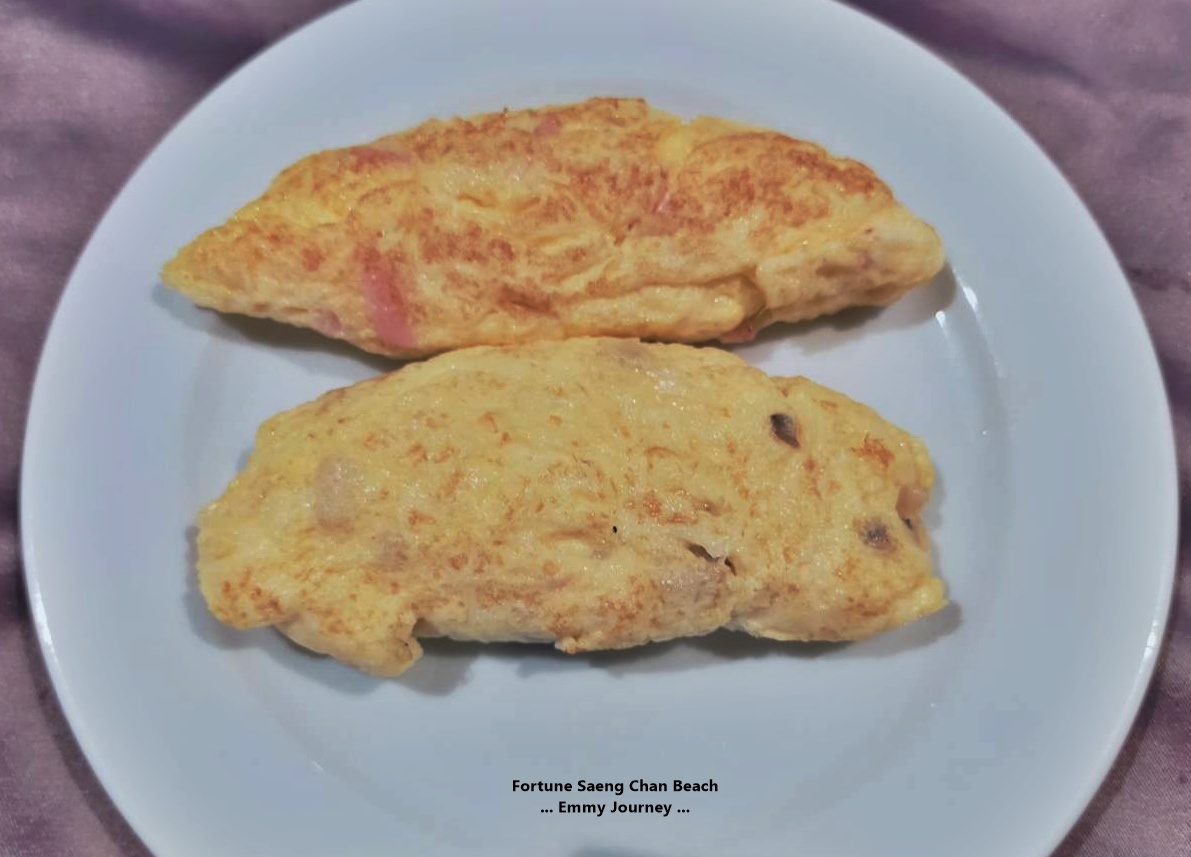 ออมเล็ตใส่มะเขือเทศ และออมเล็ตใส่แฮม ตักมาทานอย่างละชิ้น ไม่มีกลิ่นคาวไข่