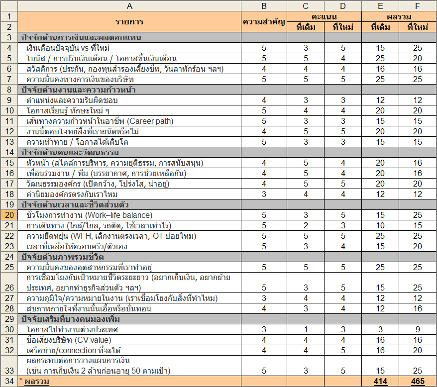 อัพเดทครับ ไปปรึกษาพี่ที่รู้จัก แล้วพี่เขาน่าจะช่วยถาม chatgpt มาให้อีกที ว่ามีปัจจัยอะไรบ้างที่ต้องคำนึงถึงหากจะย้ายงาน เลยได้มาเพียบเลย ผมลองเอามาใส่ excel จำลองเป็น matrix ใส่น้ำหนักว่าเรื่องไหนผมให้ความสำคัญมากน้อยลดหลั่นลงไป ลองใส่คะแนนและคำนวณออกมาเป็นตัวเลข แล้วรู้สึกว่ามีประโยชน์ดี เลยนำมาแชร์ต่อเผื่อจะเป็นประโยชน์กับท่านอื่นครับ