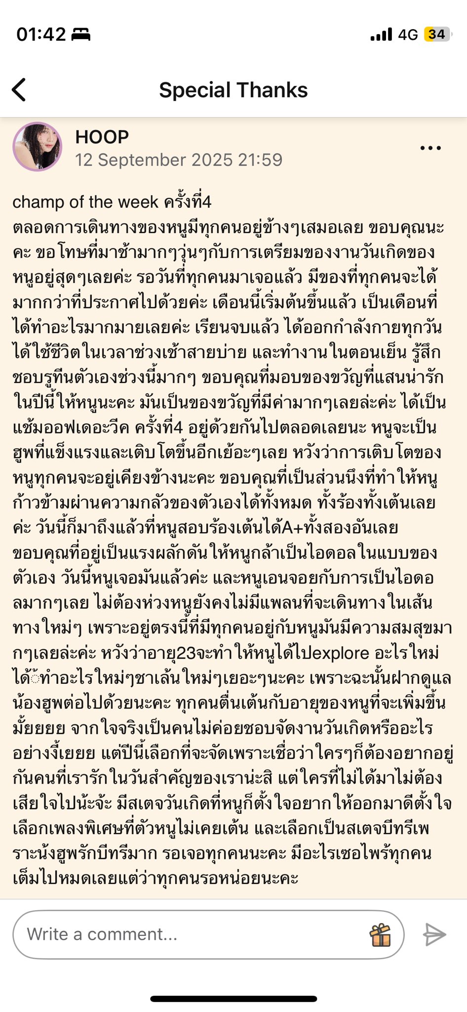 ยินดีกับน้องฮูพที่ได้ A+ ทั้งสอบร้องและสอบเต้น ช่วงนี้น้องเปล่งประกายมากๆ เก่งมากที่เป็นไอดอลที่สดใสสว่างจ้าและเต็มไปด้วยพลังงานบวกได้ขนาดนี้ น้องดูมีความสุขกับการเต้นการร้องบนเวทีมากๆกับเพลงฟักทองยิ่งชัดเจน เป็นไอดอลที่เรียนไปด้วย ทำงานไปด้วย บริหารงานไปด้วย ทำคลิปเล่นโซเชี่ยลทุกแพลตฟอร์มได้ดีมากๆ