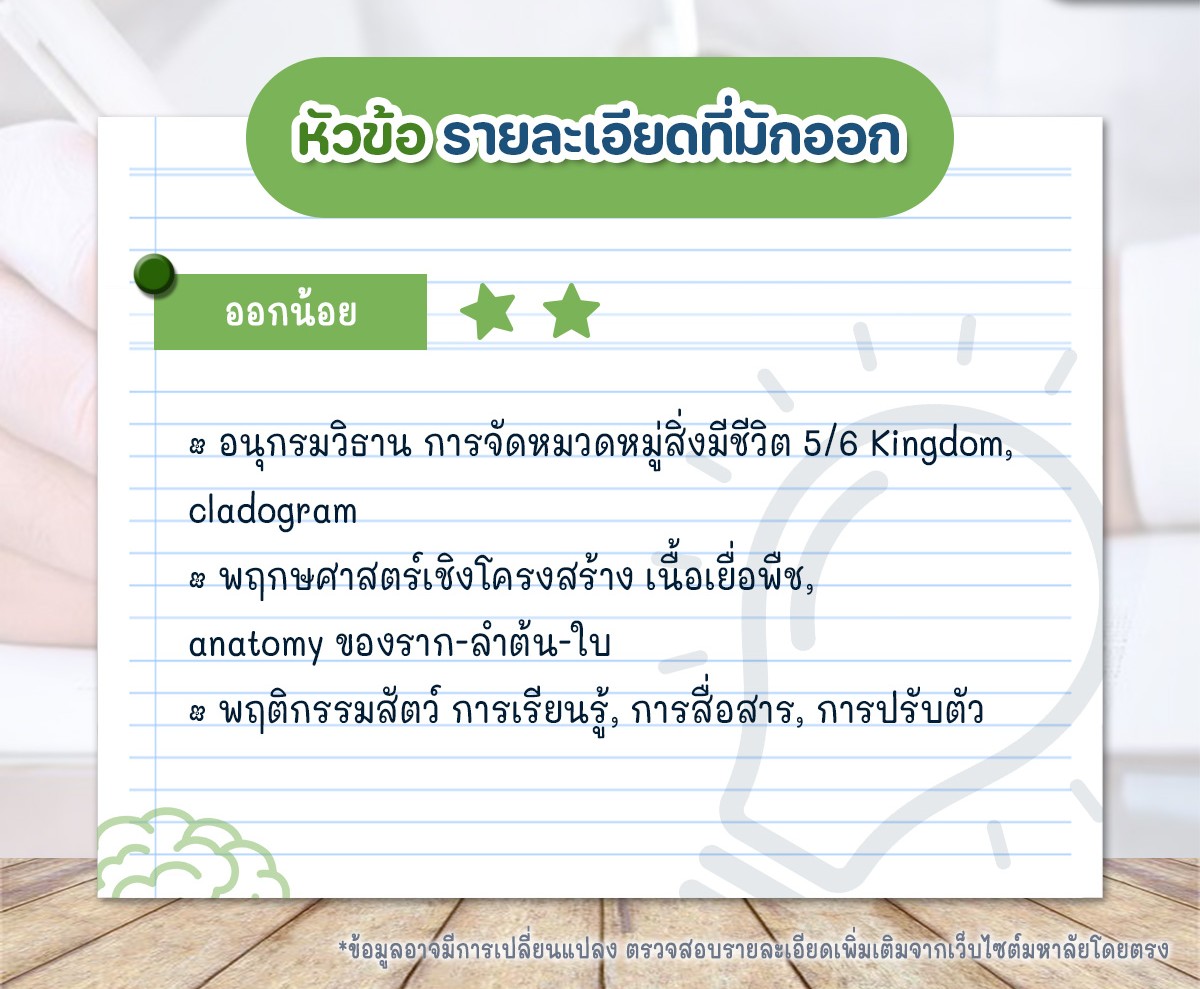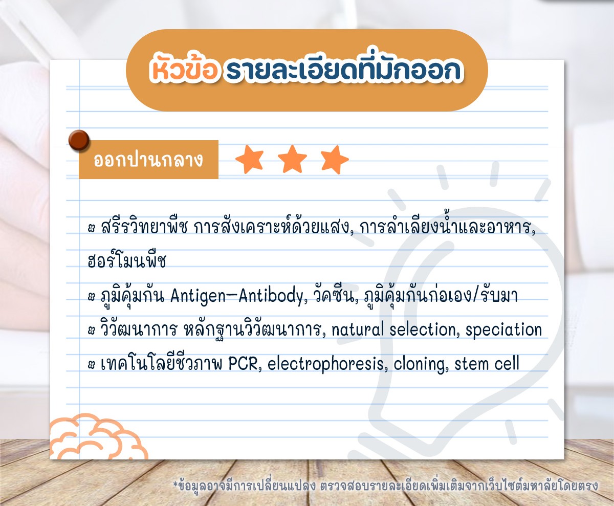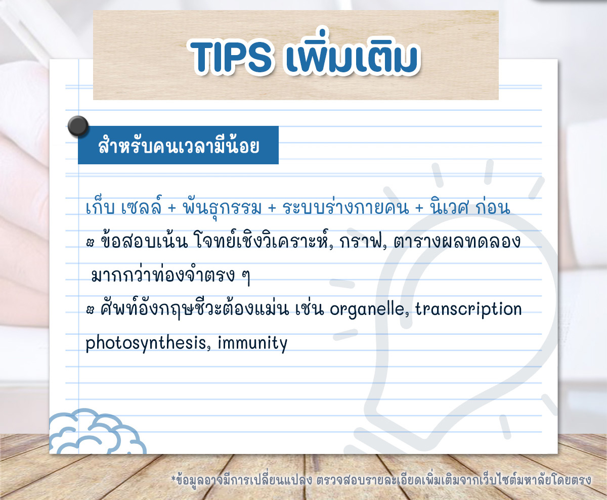 • ข้อสอบเน้นวิเคราะห์กราฟ/ตาราง/ทดลอง มากกว่าท่องคำจำ → ฝึกอ่านกราฟบ่อยๆ