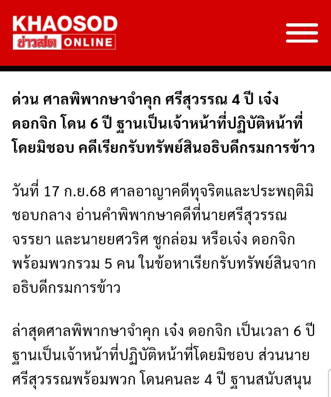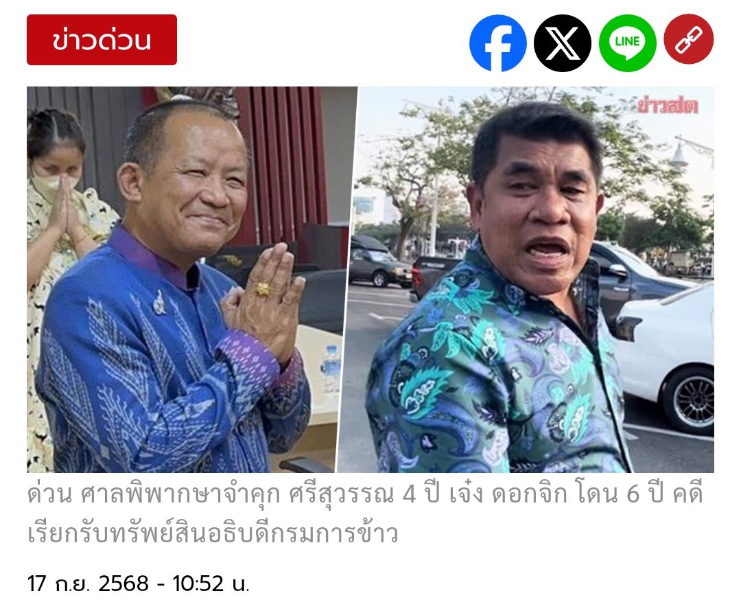 ด่วน❗️ ศาลพิพากษาจำคุก ศรีสุวรรณ 4 ปี เจ๋ง ดอกจิก โดน 6 ปี คดีเรียกรับทรัพย์สินอธิบดีกรมการข้าว
