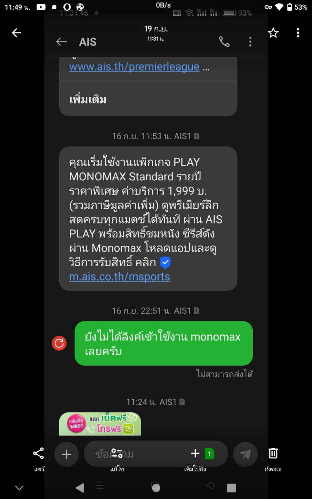 เมื่อวันที่ 16 กันยาผมสมัครดูบอลรายปี 1,999 บาทด้วยเบอร์ 061-3465401 แล้วก็ได้รับ SMS ยืนยันการสมัครเรียบร้อย แต่ใน SMS ไม่ส่งลิงค์หรือ username ที่ให้เข้าใช้งานในแอป monomax มาให้ ทำให้เข้าใช้งานแอพ monomax ไม่ได้ ติดต่อทาง my ais ก็ให้ฝาก email ไว้แล้วก็เงียบ...ทาง line ยิ่งเงียบสนิท...ช่วยเช็คให้ทีนะครับ