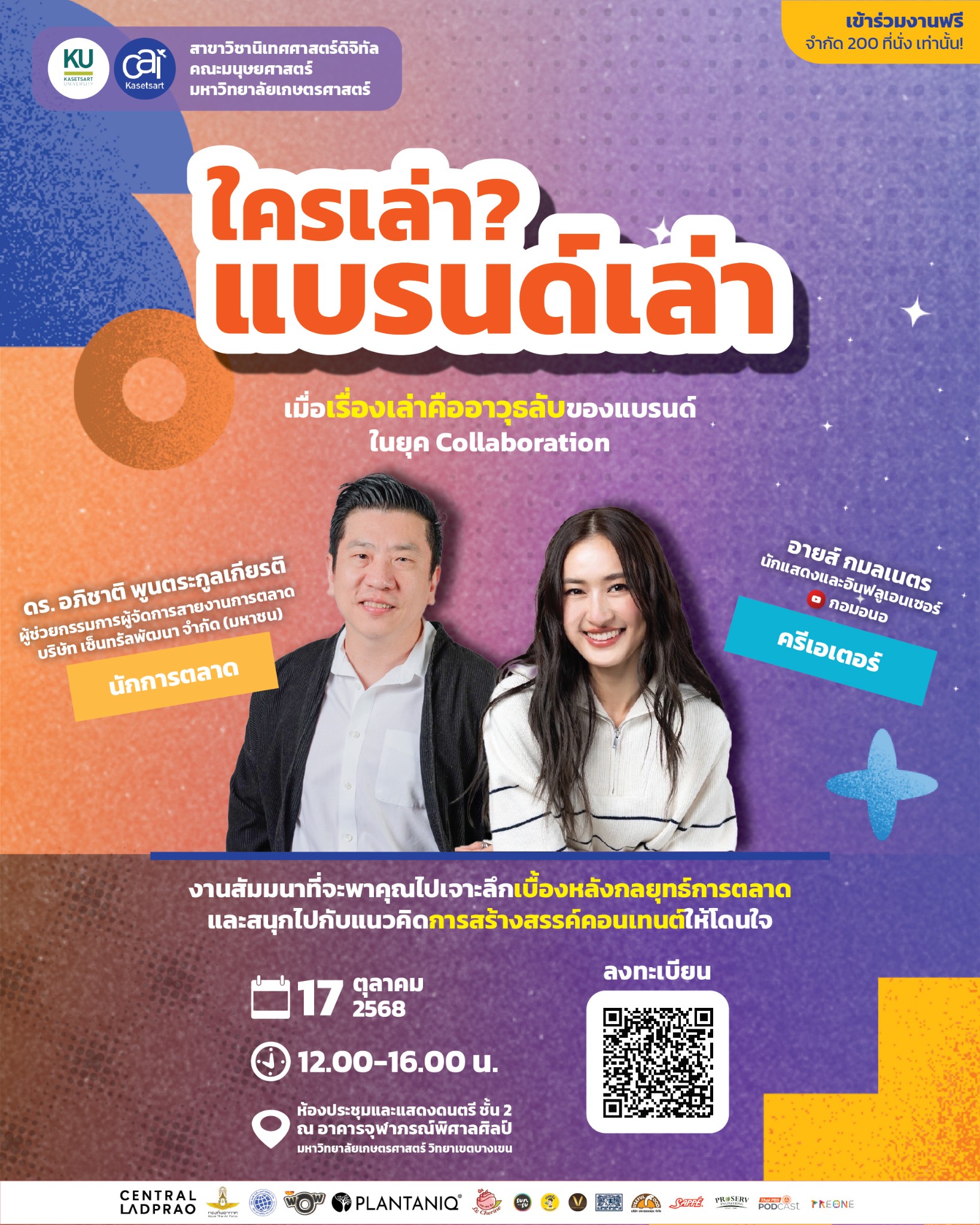 “ใครเล่า? แบรนด์เล่า : เมื่อเรื่องเล่าคืออาวุธลับของแบรนด์ในยุค Collaboration” สัมมนาทางวิชาการของหลักสูตรปริญญาโท สาขานิเทศศาสตร์ดิจิทัล ภาควิชานิเทศาสตร์และสารสนเทศศาสตร์ คณะมนุษยศาสตร์ มหาวิทยาลัยเกษตรศาสตร์ ที่จะมาตอบคำถามทุกข้อสงสัย ไขทุกข้อข้องใจ พร้อมเคล็ดลับอัพเดทใหม่ๆ จาก ดร. อภิชาติ พูนตระกูลเกียรติ ผู้ช่วยกรรมการผู้จัดการสายงานการตลาด บริษัท เซ็นทรัลพัฒนา จำกัด (มหาชน) นักการตลาดมืออาชีพ พร้อมคุณอายส์ กมลเนตร เรืองศรี นักแสดงและอินฟลูเอนเซอร์ชื่อดัง เจ้าของเพจและชาแนล กอมอนอ ในวันศุกร์ที่