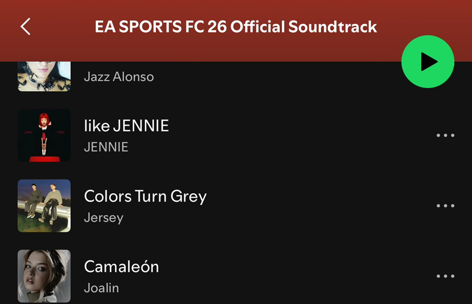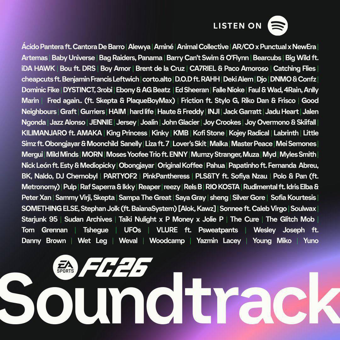 หลังจากที่เกมกีฬาและโดยเฉพาะอย่างยิ่งเกม FIFA ในอดีตได้รับชื่อเสียงไปทั่วโลก ตอนนี้ก็ได้ปล่อยเพลงประกอบเกม "EA Sports FC 26" ออกมาแล้ว โดยมีแนวโน้มว่าจะเป็นหนึ่งในเพลงประกอบที่หลากหลายที่สุดของแฟรนไชส์นี้ในรอบกว่า 20 ปี