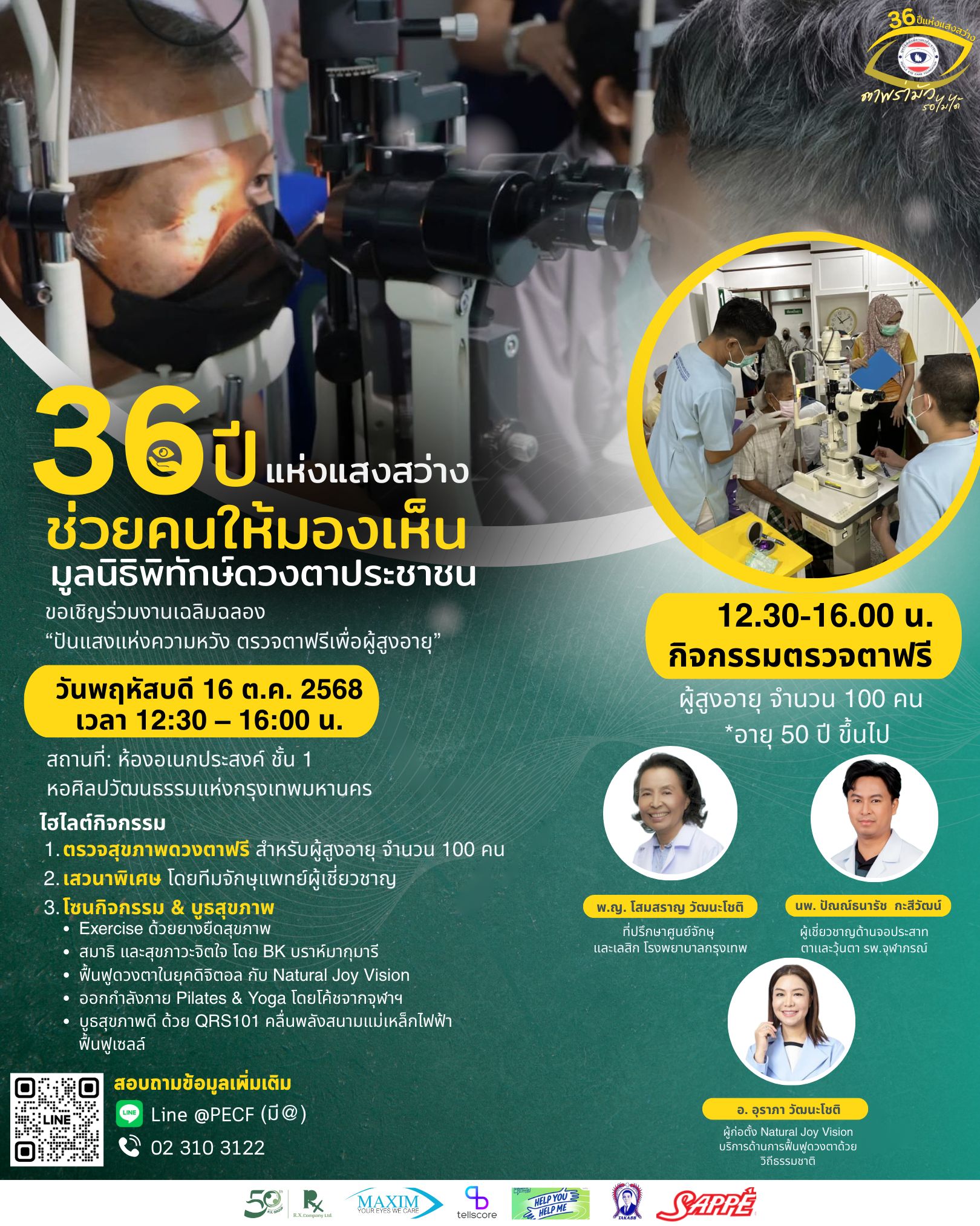 ขอเชิญร่วมงาน “36 ปีแห่งแสงสว่าง…ช่วยคนให้มองเห็น” ครบรอบ 36 ปี มูลนิธิพิทักษ์ดวงตาประชาชน