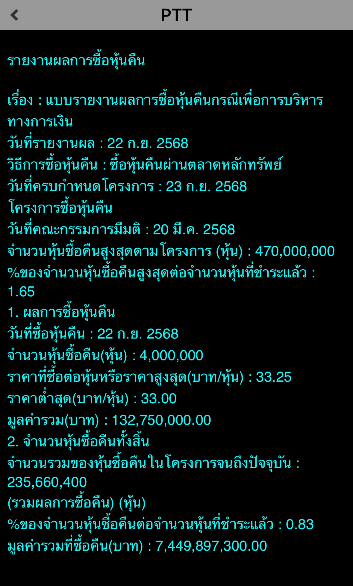 รายงานการซื้อหุ้นคืนของ PTT ประจำวันที่ 25 มีนาคม 2568 จำนวนที่ซื้อคืน 21,500,000 หุ้น ราคาสูงสุดต่อหุ้นที่ซื้อ 32.50 บาท ราคาต่ำสุดต่อหุ้นที่ซื้อ 32.25 บาท มูลค่ารวม 690,075,000.00 บาท