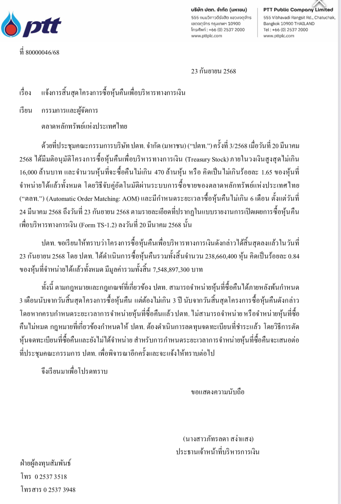PTT แจ้งการสิ้นสุดโครงการซื้อหุ้นคืนเพื่อบริหารการเงิน