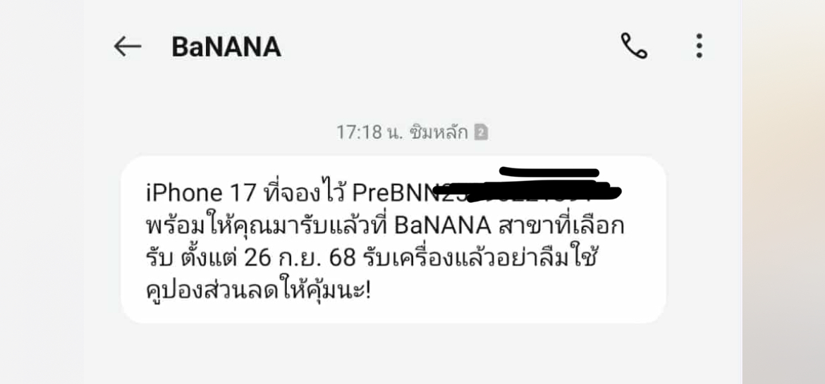 ไปจองโทรศัพท์ที่ Banana แล้วมีข้อความส่งมา คือได้เครื่องตามข้อความมั้ยคะ