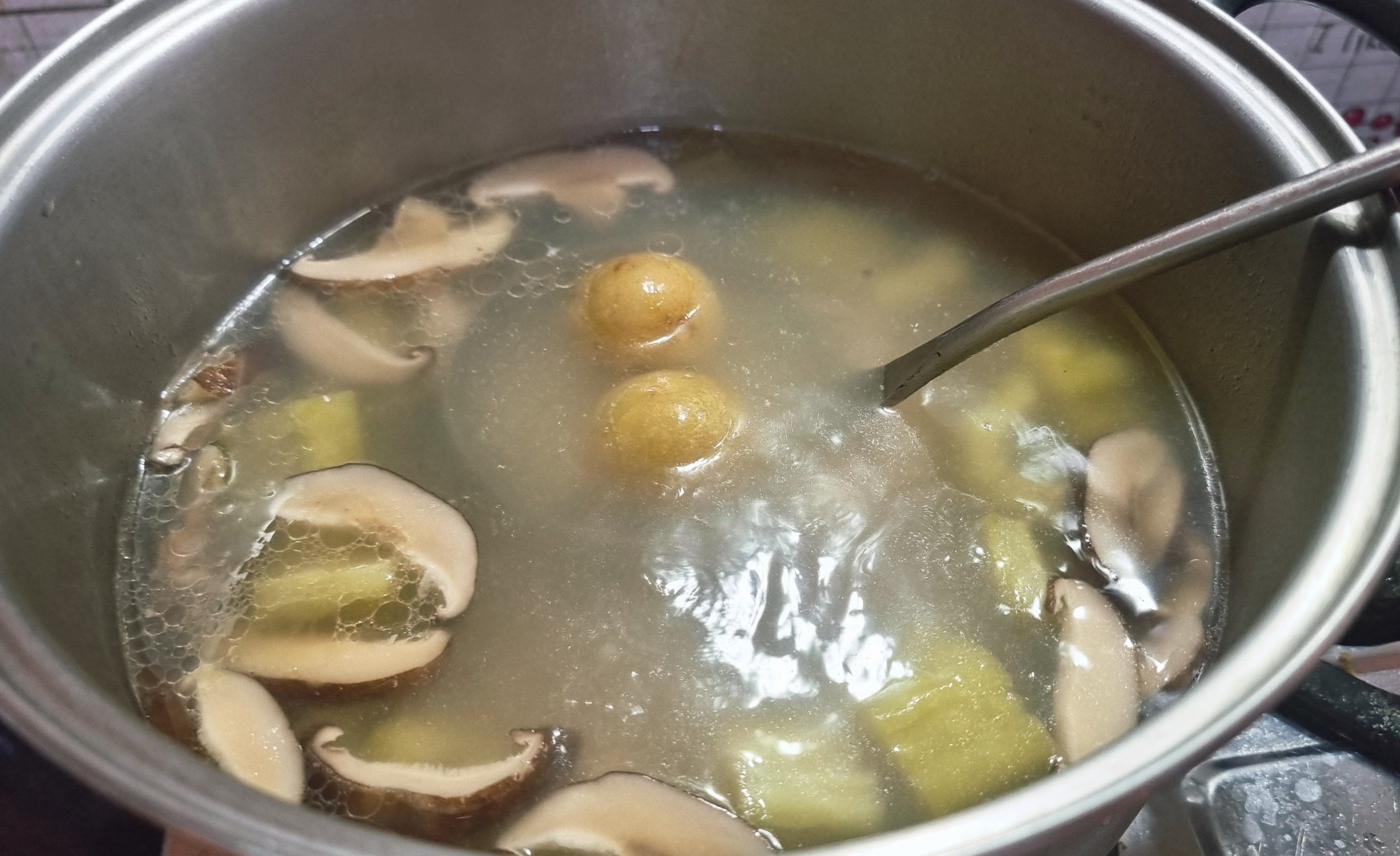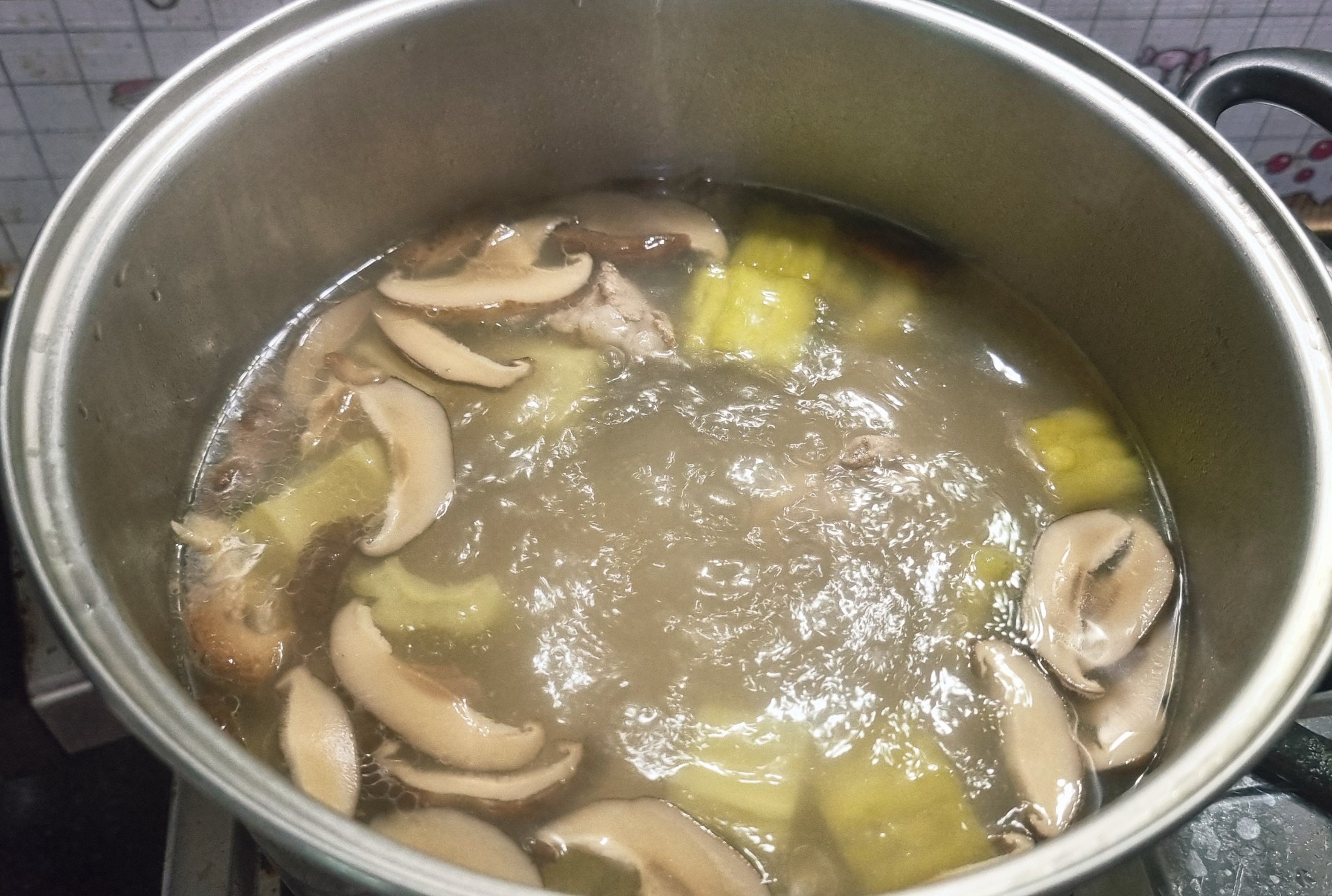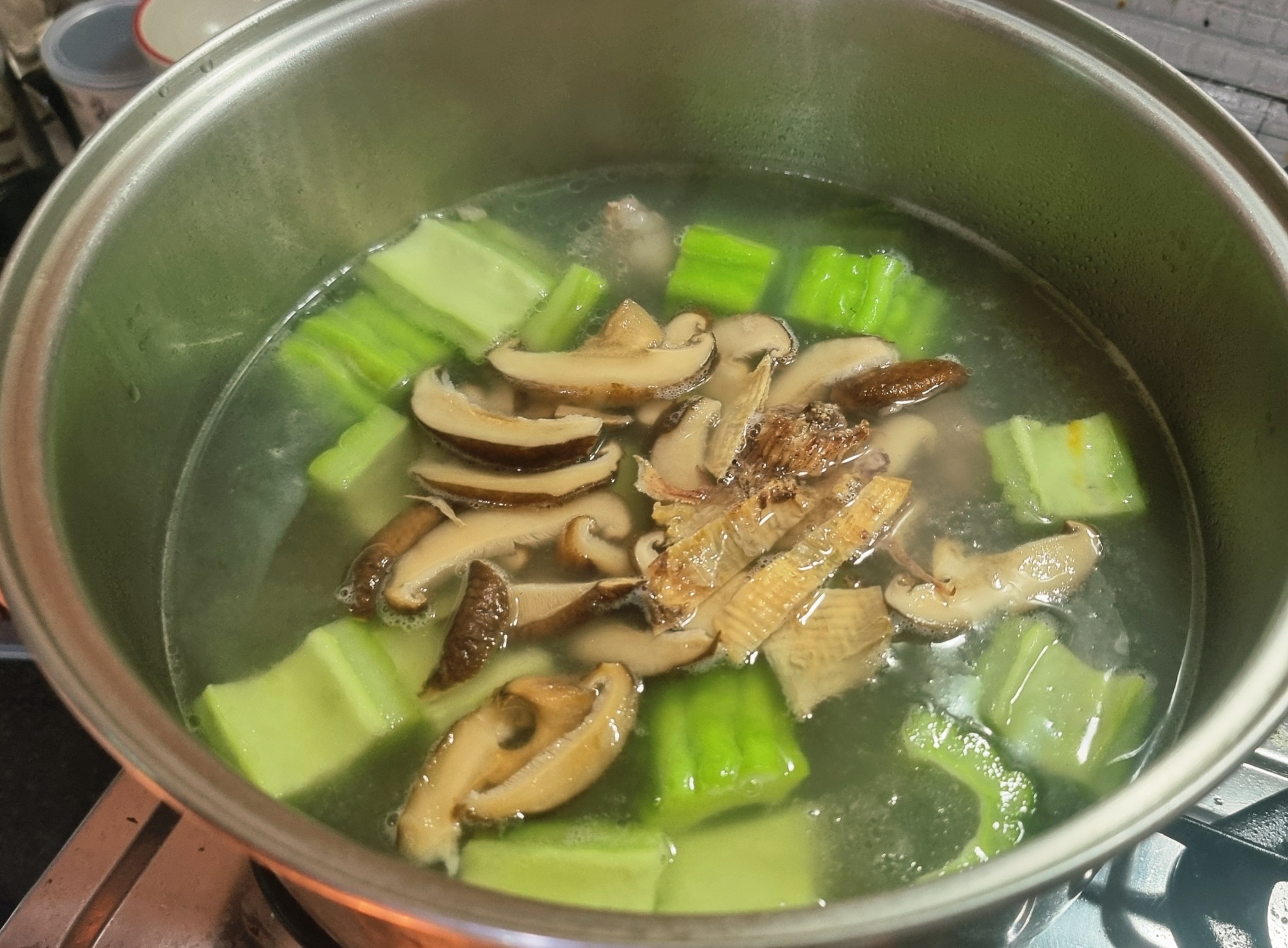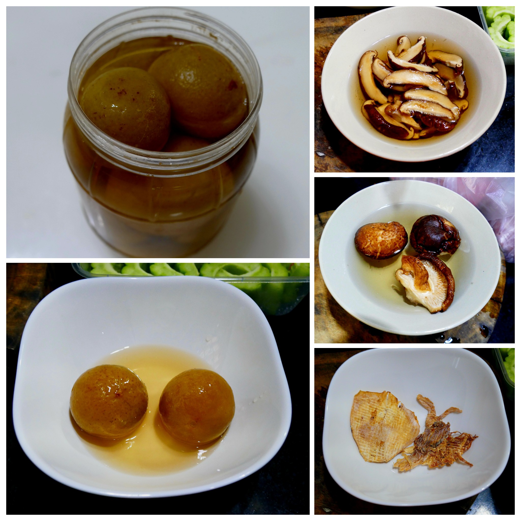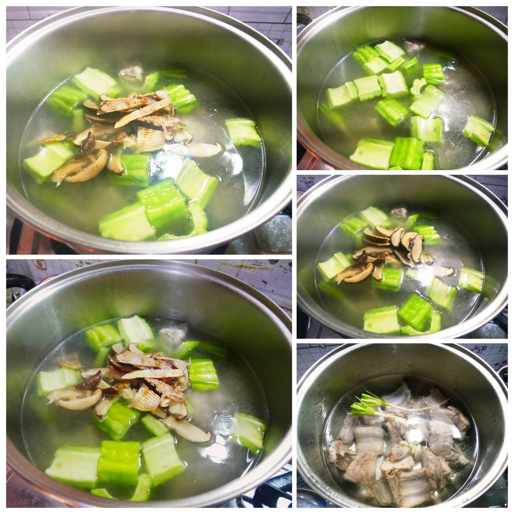 3. เอามะระใส่ลงไป ตามด้วยเห็ดหอม , ปลาหมึกแห้ง..... ต้มไปเรื่อยๆ จนสีเขียวสดของมะระหายไป ซี่โครงหมูนุ่มๆๆ