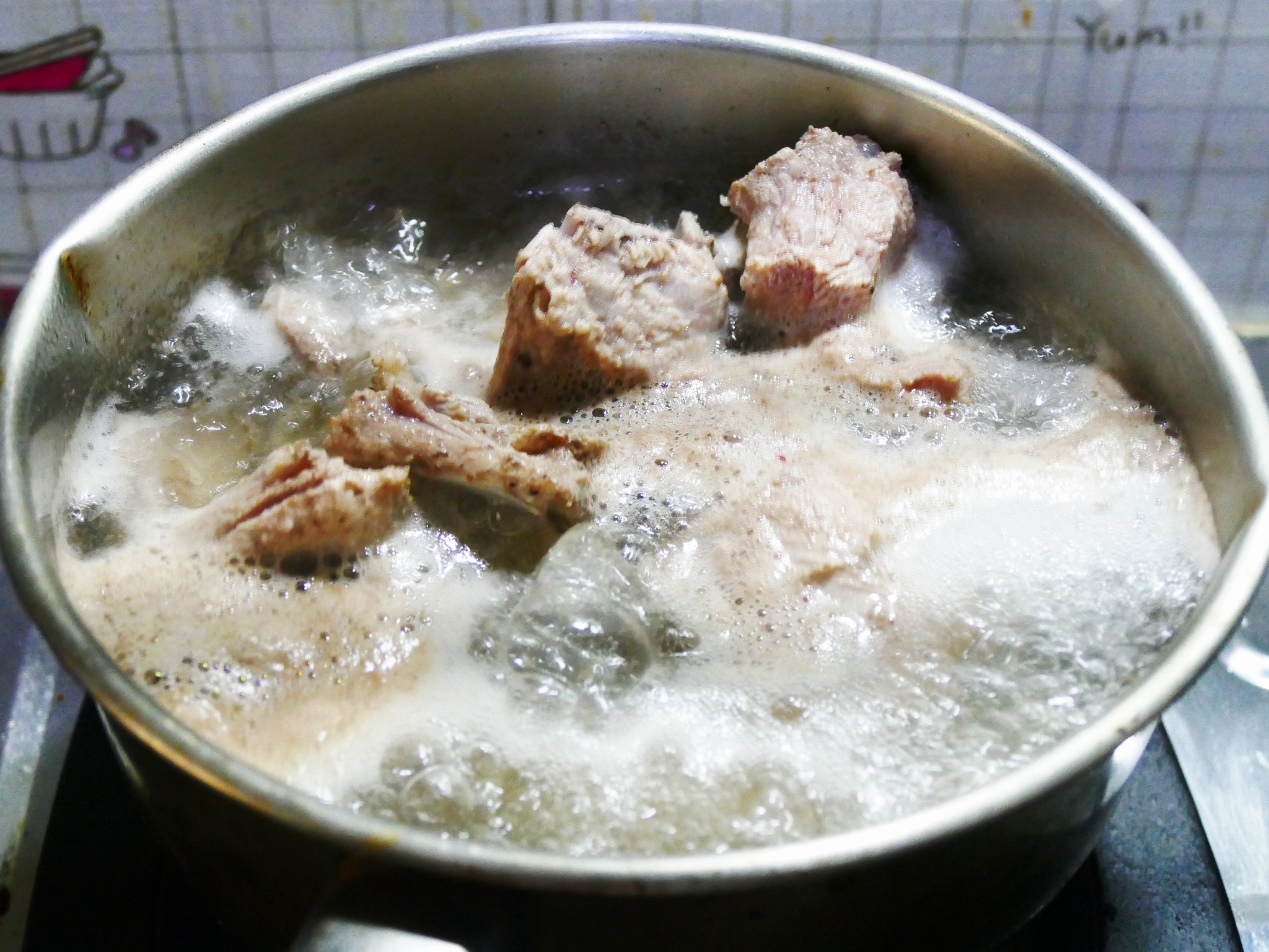 1. ล้างซี่โครงหมู ด้วยเกลือ จากนั้นล้างน้ำ เอามาต้มน้ำทิ้ง 1 ครั้ง