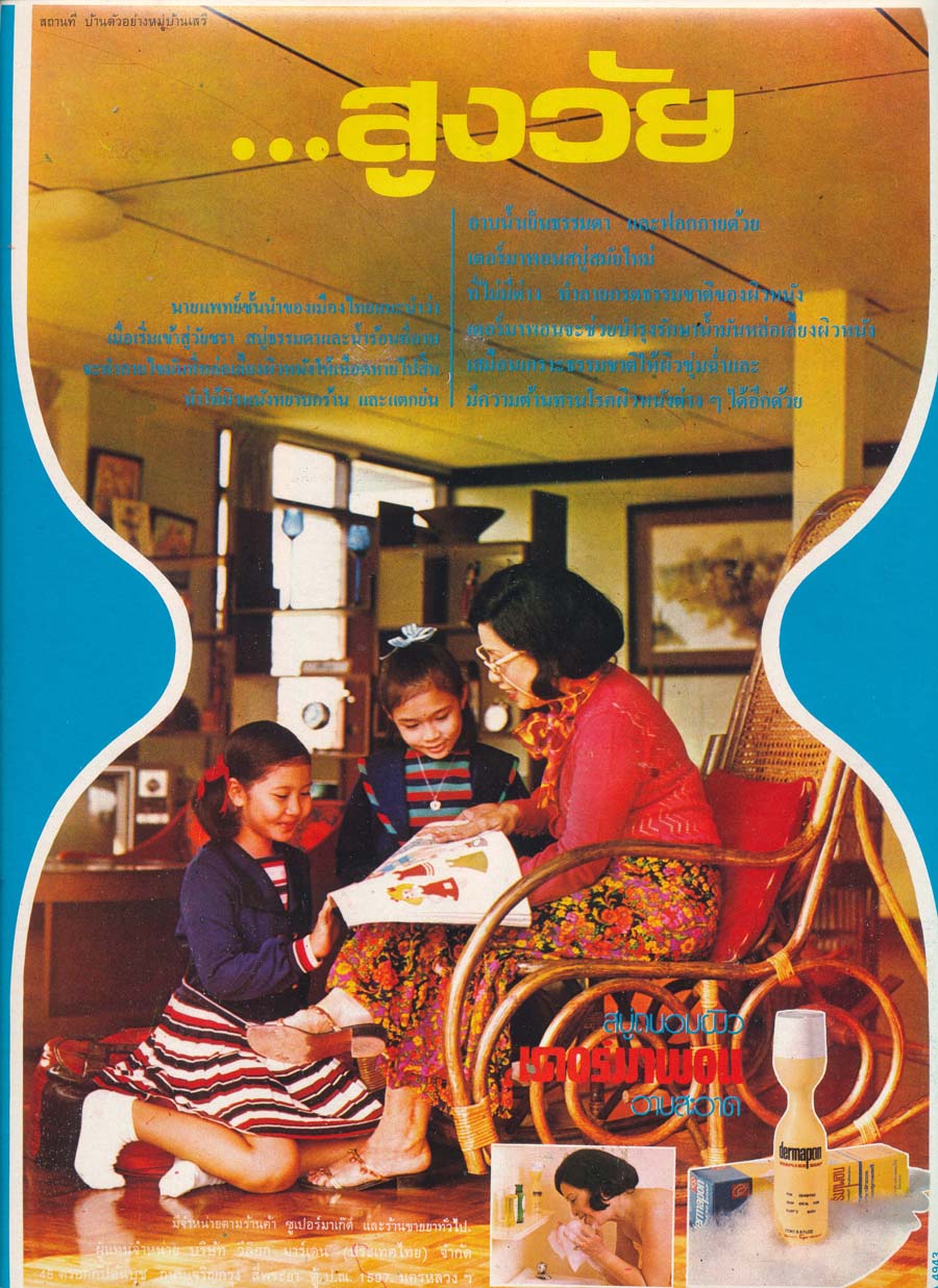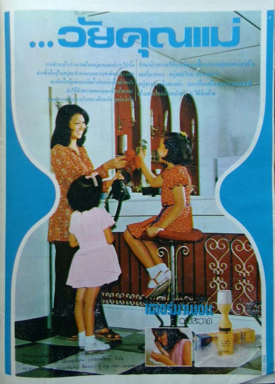 มีสินค้าหนึ่งที่ดังมากในยุคนั้น เป็นสบู่เหลวทำความสะอาด ซึ่งมีกลิ่นแปลกประหลาดเหมือนสารเคมีทำความสะอาดในสมัยนี้ ชื่อยี่ห้อคือเดอร์มาพอน ซึ่งยังมีผลิตภัณฑ์อื่นๆขายอยู่จนถึงทุกวันนี้ แต่เจ้าสบู่เหลวที่ว่านี่ไม่เห็นนานแล้ว กลิ่นของมันเป็นเอกลักษณ์มาก หากใครอาบน้ำด้วยสบู่นี้ กลิ่นจะติดตัวเหมือนสบู่นกแก้ว ติดไปทั้งวัน และมีโฆษณาแชมพูยี่ห้อ แคลรอลกลิ่นพฤกษา หรือ clairol herbal ซึ่งยังมีขายอยู่จนทุกวันนี้ นับว่าอยู่ยงคงกระพันมากๆ