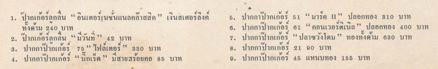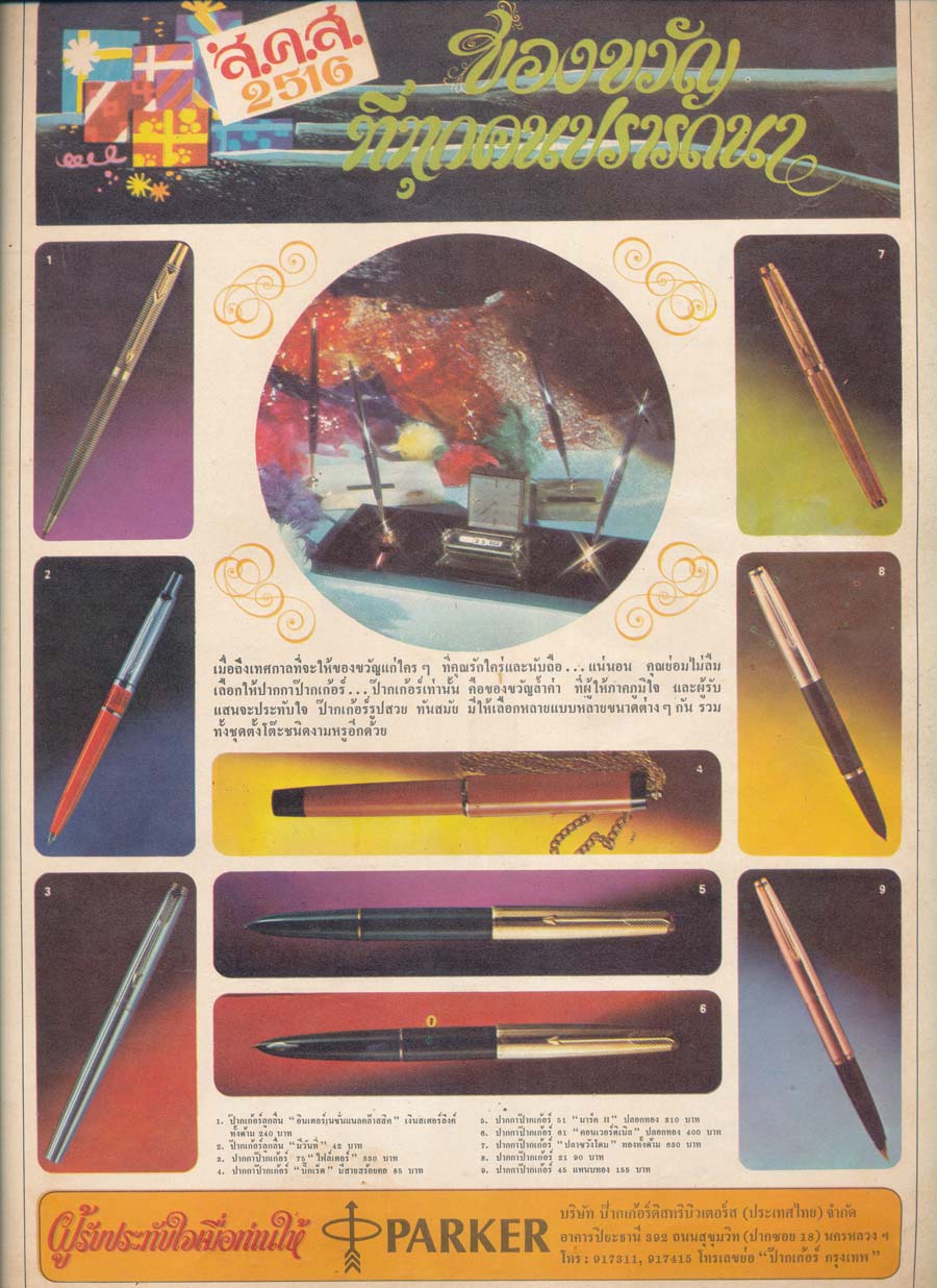 โฆษณาปากกาป๊ากเกอร์ ปากกามีระดับ ผู้ที่จะมีปากกานี้ใช้ก็จะต้องมีทรัพย์สักหน่อย เพราะดูจากราคาปากกาปลอกทองทั้งด้าม ๖๓๐ บาท (๖๓๐ * ๒๒.๕ = ๑๔,๑๗๕) เกือบเท่าเงินเดือนทั้งเดือนของข้าราชการชั้นตรี ด้ามที่ราคาถูกที่สุดเป็นปากกาลูกลื่นชนิดกด มีปฏิทินหมุนได้ที่ด้ามด้วย ราคา ๔๒ บาท (๔๒ * ๒๒.๕ = ๙๔๕) เด็กนักเรียนทั่วไปไม่มีปัญญาใช้ ต้องใช้ปากกาบิคด้ามละ ๑ บาท ปากกาหมึกซึมไพลอตด้ามละสิบกว่าบาท ซึ่งแค่นั้นพ่อแม่ก็บ่นแล้วว่าแพง