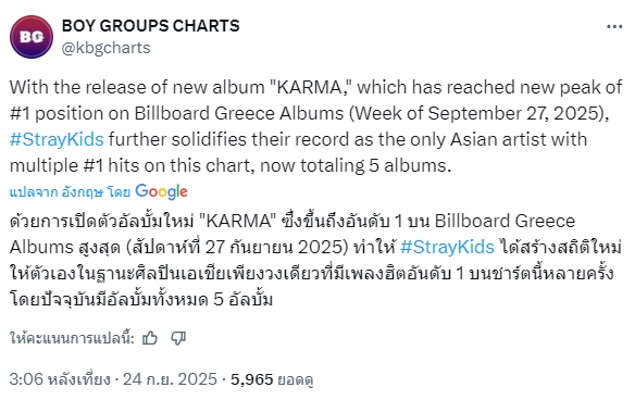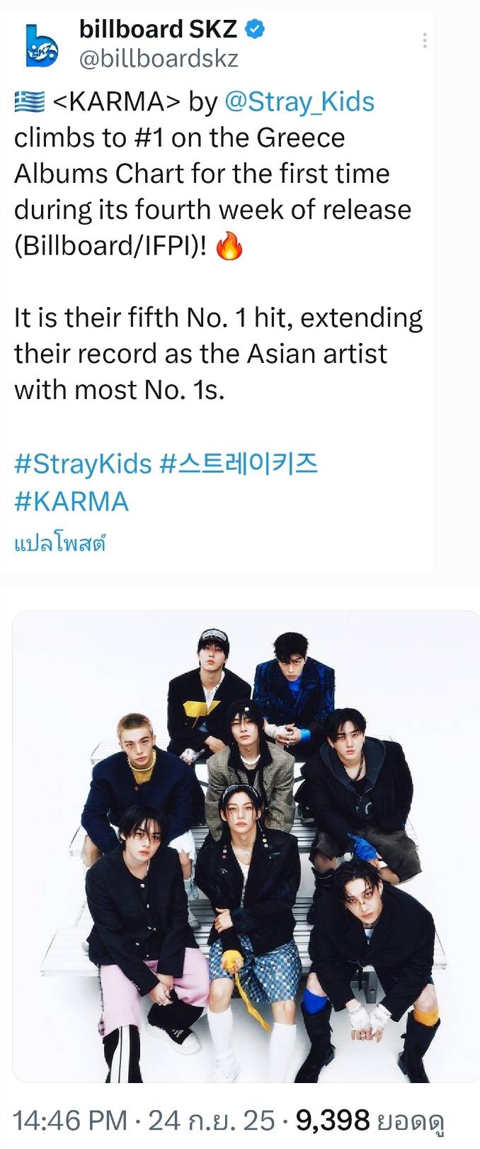 🔥 Stray Kids “KARMA” ไต่ขึ้นอันดับ 1 บนชาร์ตอัลบั้มกรีซเป็นครั้งแรกในช่วงสัปดาห์ที่ 4 ของการเปิดตัว บน Billboard Greece Albums (สัปดาห์ที่ 27 กันยายน 2025) ทำให้พวกเขากลายเป็นศิลปินชาวเอเชียเพียงวงเดียวที่มีเพลงฮิตอันดับ 1 บนชาร์ตนี้หลายครั้ง โดยปัจจุบันมีอัลบั้มทั้งหมด 5 อัลบั้ม