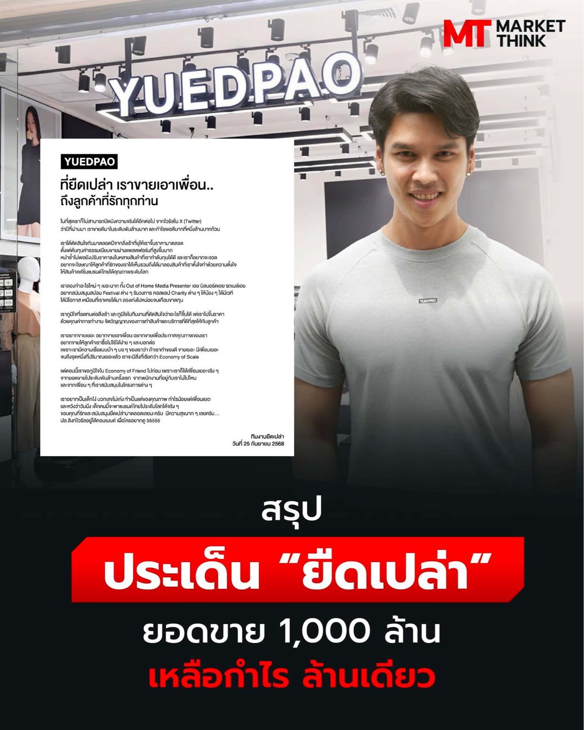 - ล่าสุด เพจเฟซบุ๊ก Yuedpao - ยืดเปล่า ยืดแต่ไม่ย้วย ออกมาอธิบายประเด็นเกี่ยวกับผลประกอบการของแบรนด์ ที่กำลังเป็นไวรัลบน X (Twitter) ว่า ทำไมรายได้บริษัทระดับพันล้าน แต่กำไรเหลือ ล้านเดียว