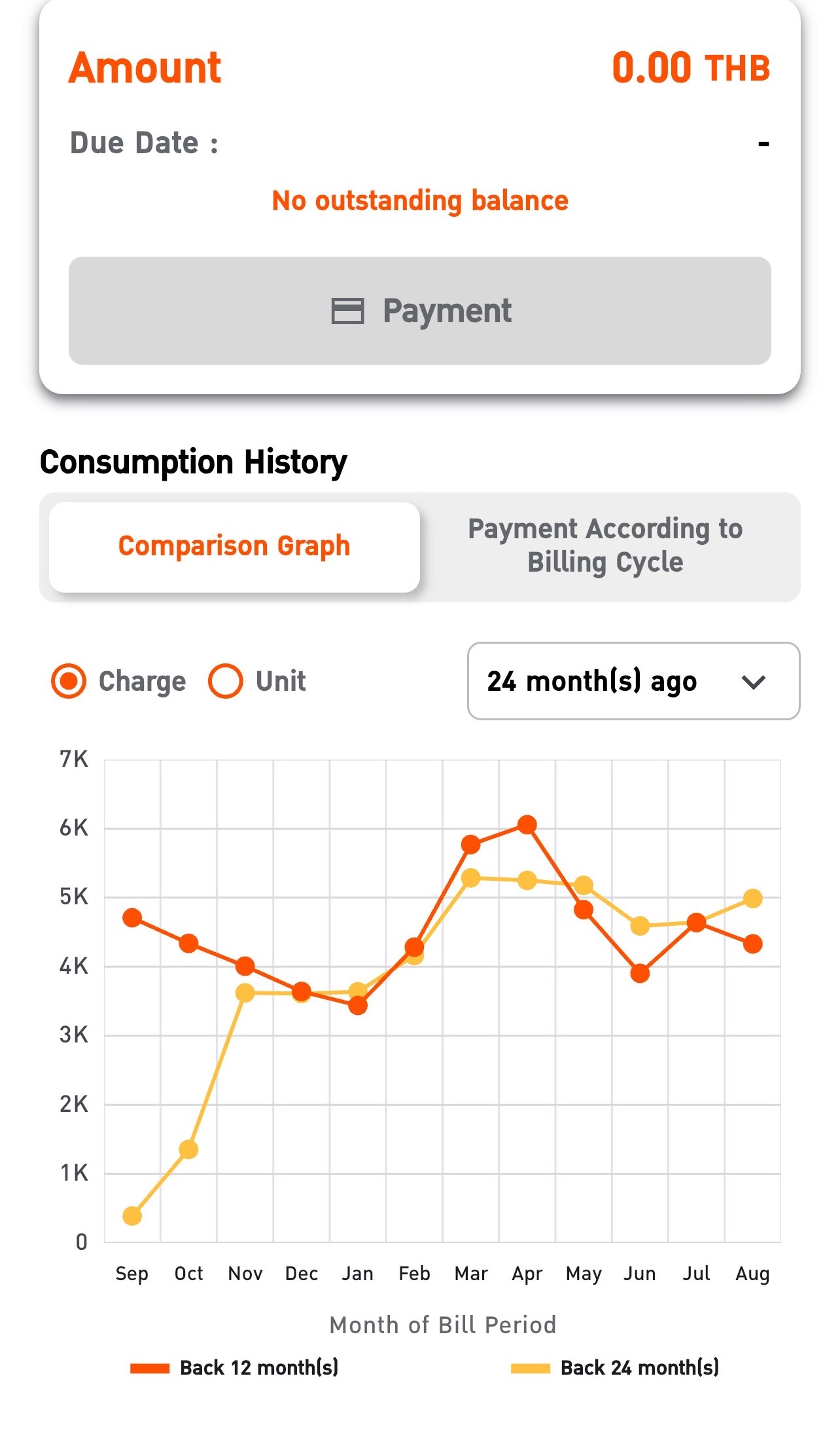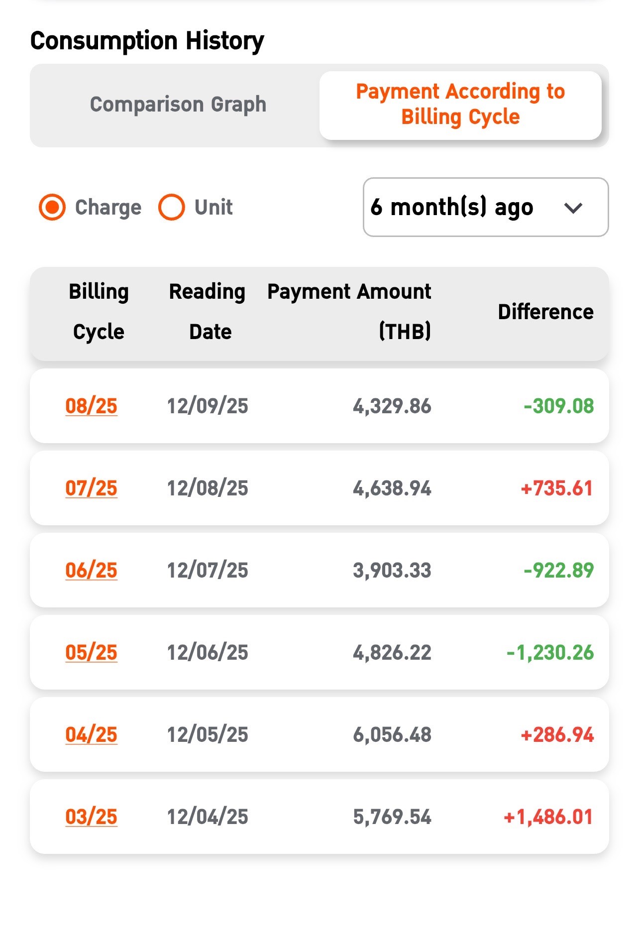 แต่ถ้าอยากดูยอดเงิน หรือ หน่วยที่จ่ายที่ใช้แต่ละเดือน ต้องมาเลือกหัวข้อ payment According to billing cycle จะขึ้นยอดหน่วยใช้ หรือ ยอดค่าไฟ เทียบกับเดือนก่อนหน้ามาให้ครับ ถ้ามีค่าไฟที่สูงขึ้นผิดปกติ แอพจะเตือนด้วยนะ