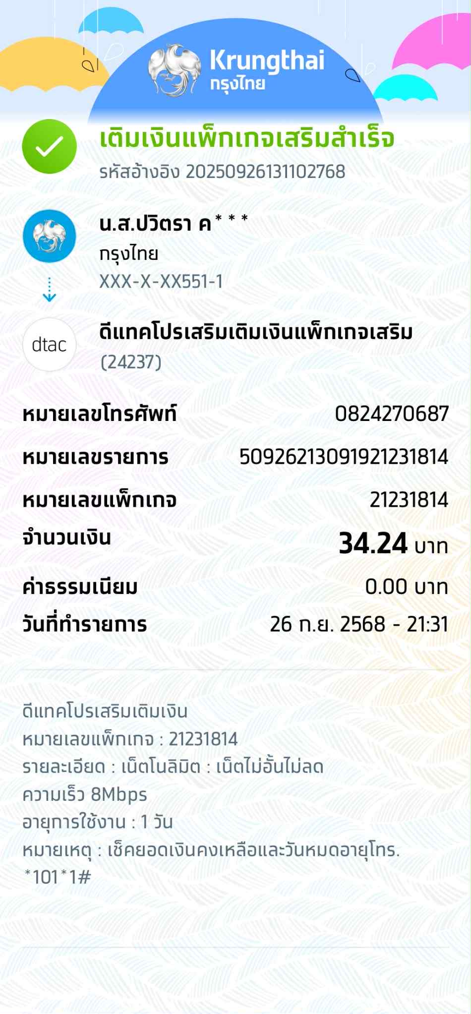พอดีจะจ่ายค่าเน็ตดีแท็ค แต่มันไม่ขึ้นบิล แต่ให้จ่ายแค่ครึ่งนึงของค่าเน็ต ค่าเน็ต422 แต่เราจ่ายไปแล้ว211บาท ต้องทำยังไงคะ