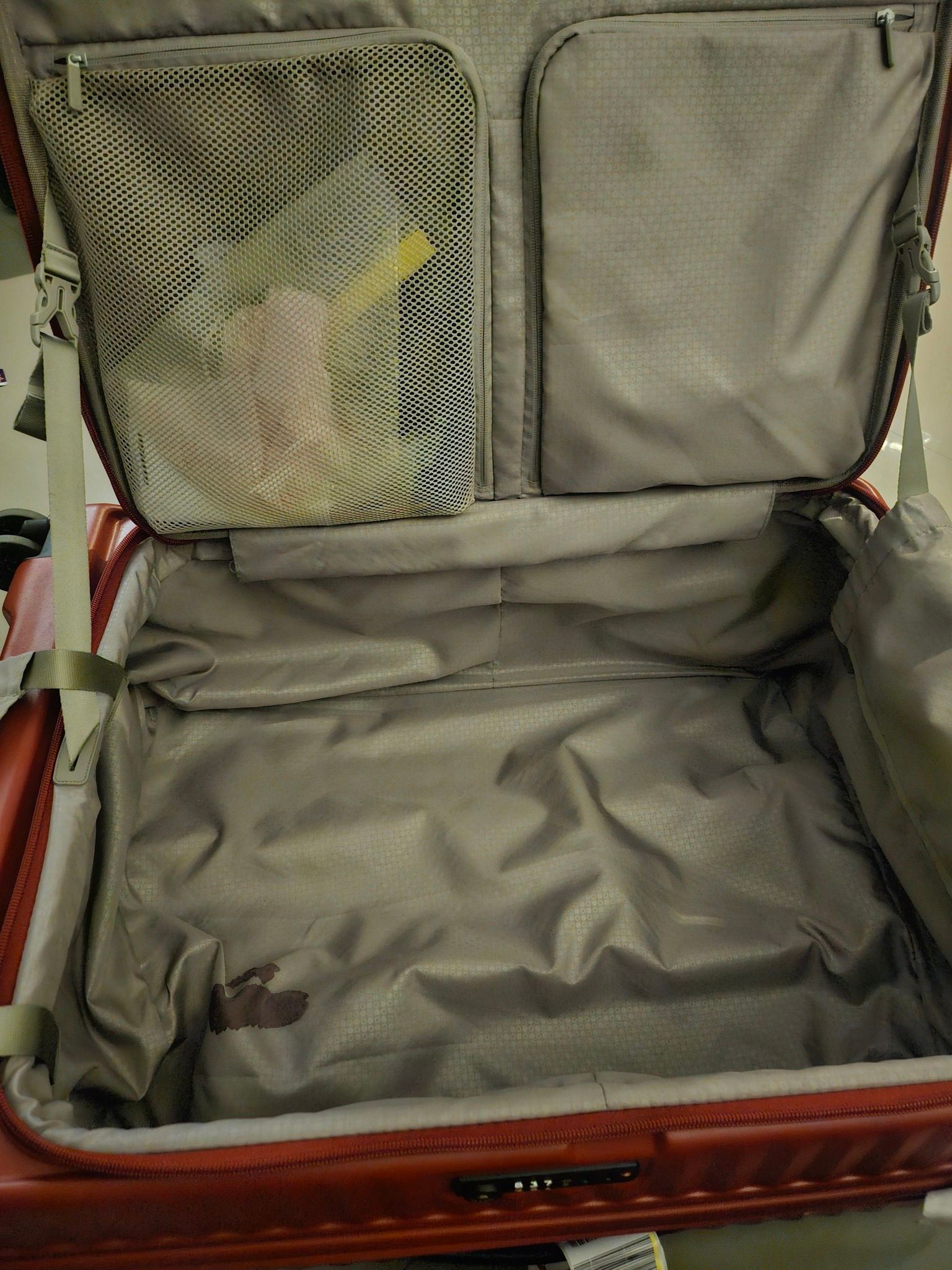 กระเป๋าเดินทางถูกเปิด และมีคราบเลอะ (ไม่รู้ว่าคืออะไร?)