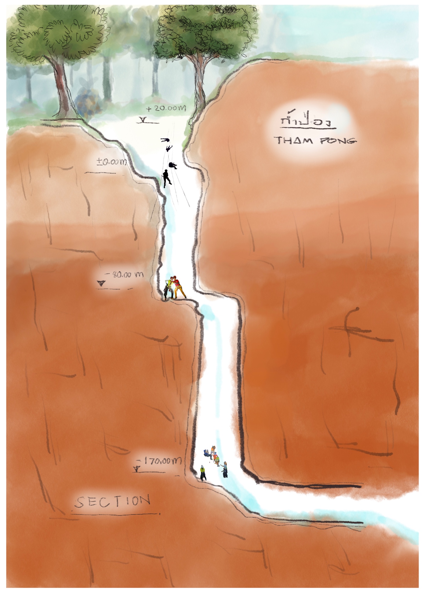 การลงไปที่ก้นถ้ำป่องนี้ทำได้วิธีเดียวคือ โรยตัวลงไปแล้วปีนกลับขึ้นมาทางเดิม