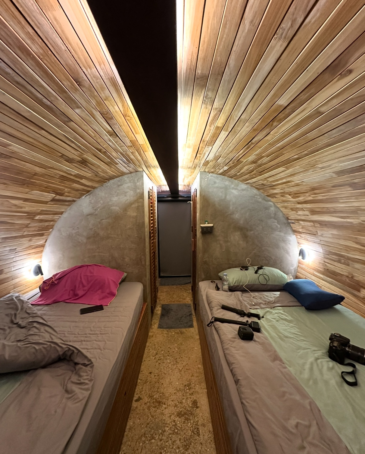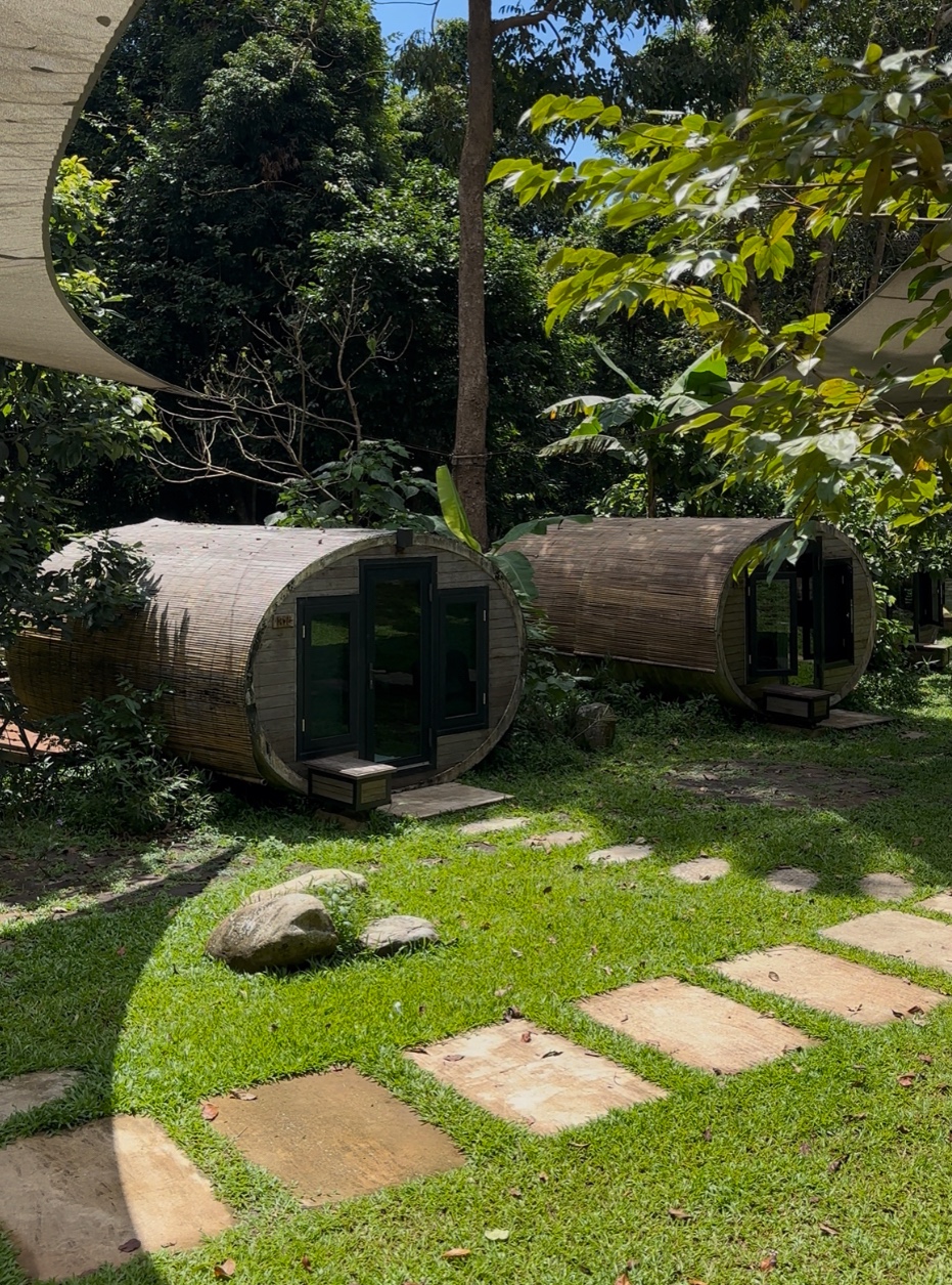 เรานั่งกระเทือนไส้จนมาถึงที่The Rock Lodge ในเวลา 12:50 ห้องพักเป็นแนวแคปซูลขอนไม้ ขนาดกะทัดรัด น่ารัก เดินเข้าไปเป็นหลัง ๆ มีห้องน้ำในตัว แยกสัดส่วน ห้องอาบน้ำห้องส้วม ใครตัวสูงนี้มีหัวชนกันบ้างและอาจจะต้องยืนเอียงคออาบน้ำ ที่จริงเค้าก็ทำที่นั่งให้อาบแหล่ะ ทางเข้ามีชั้นวางของเป็นพวก กาแฟดริป น้ำเปล่า กาน้ำร้อนไฟฟ้า ไดร์เป่าผม 1200 W เล็ก ต้องเป่านานแต่ก็ยังดีกว่าไม่มี แต่เตียงนอนถือว่านอนสบายทีเดียว มีพื้นที่สำหรับวางสัมภาระที่พื้นท้ายเตียง เดินต่อไปเป็นระเบียงชิว ๆ มีอ่างล้างหน้าพร้อมกระจก อยู่ด้วย แต่กลางคืนแมลงจะเยอะหน่อย ต้องพกยากันยุงมาด้วยนะ  แต่ห้องมีแอร์พร้อม สบาย