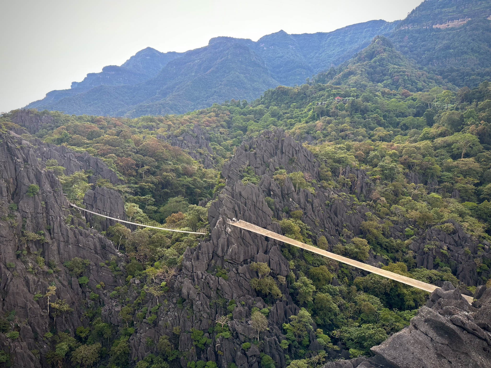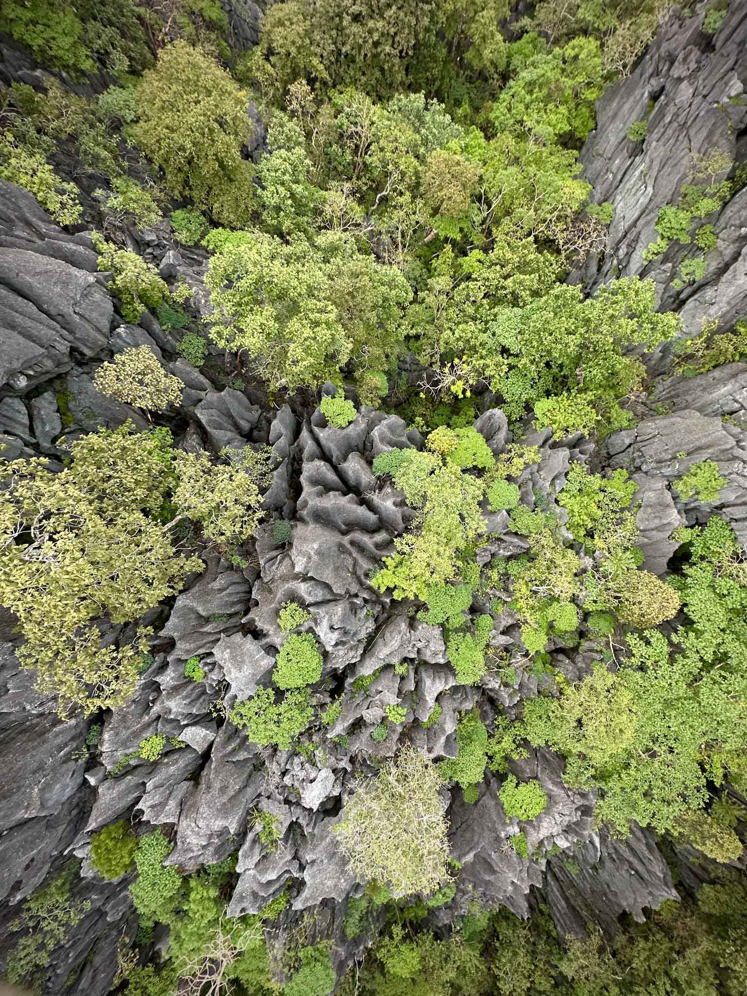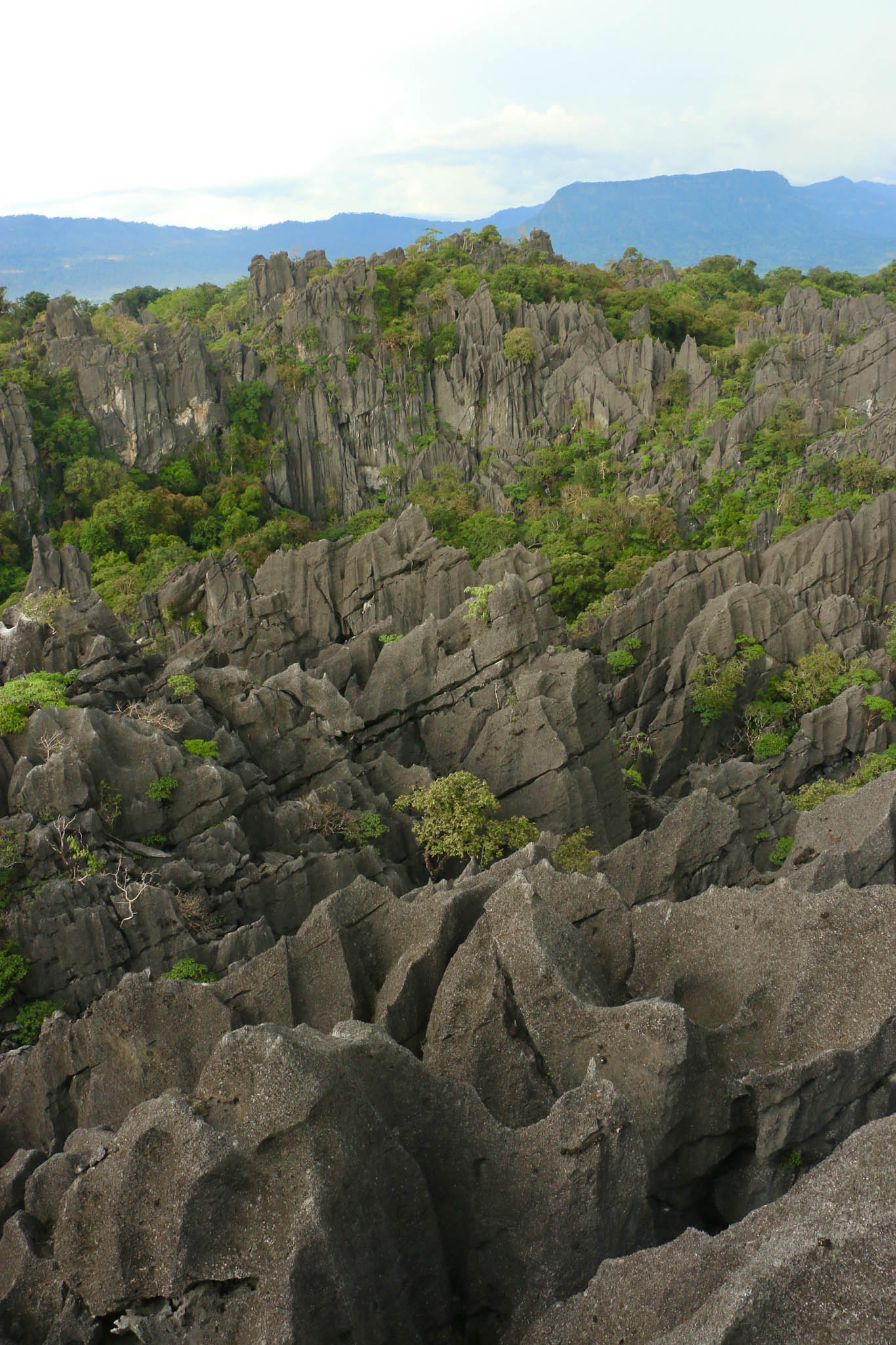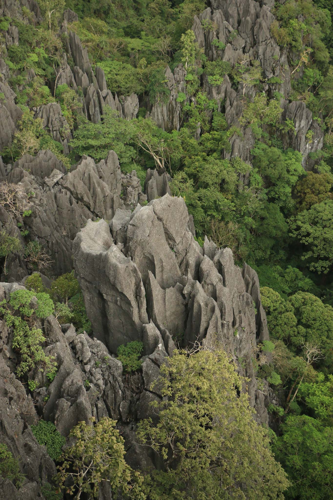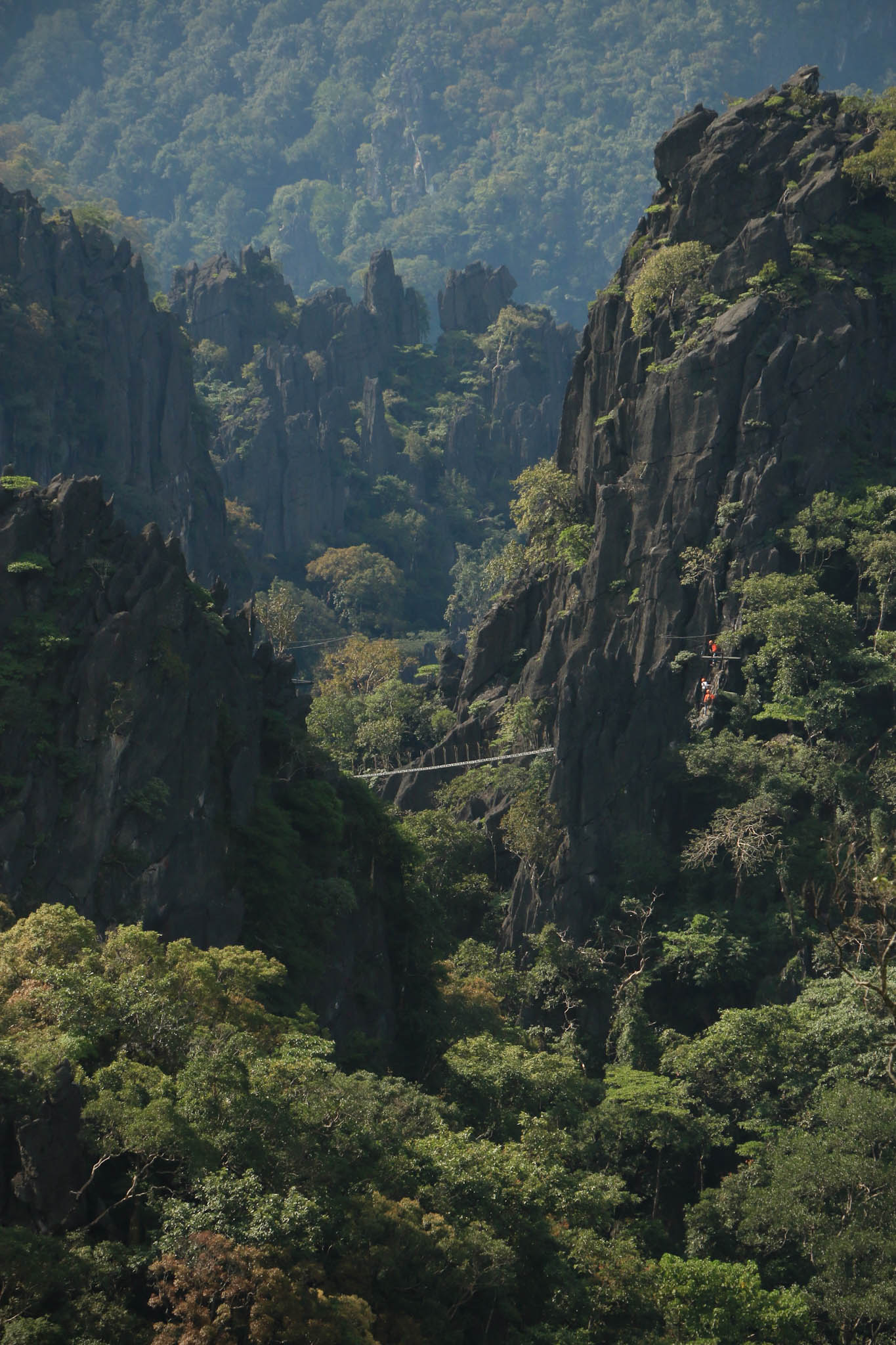 ภูเขาที่นี่เป็นภูเขาหินปูนที่มีต้นไม้ขึ้นเขียวแซมสวยมาก และได้เห็นค่างหน้าขาว (Laotian Langur) อยู่บนยอดไม้ 3-4 ตัวไกล ๆ ด้วย หางยาวดำ ๆ ซึ่งเป็นสัตว์ที่หาดูได้ยากใกล้สูญพันธ์